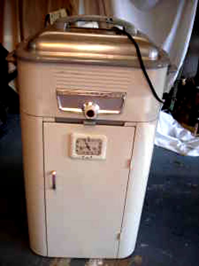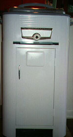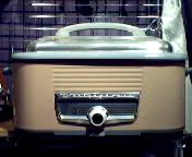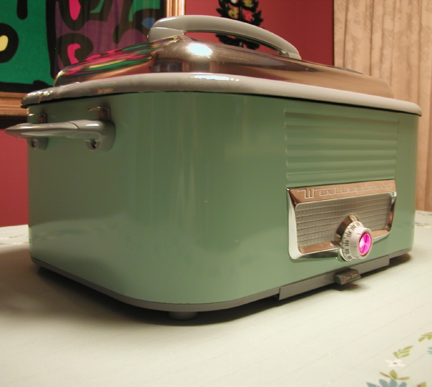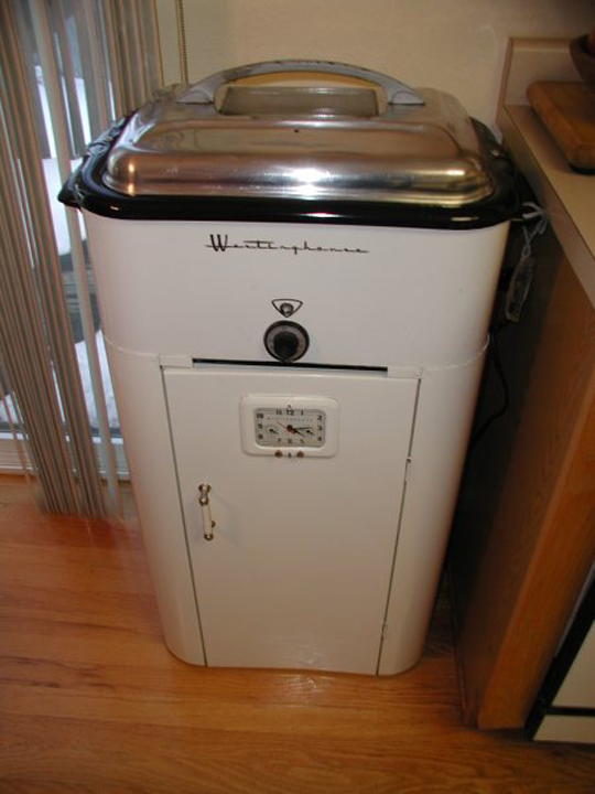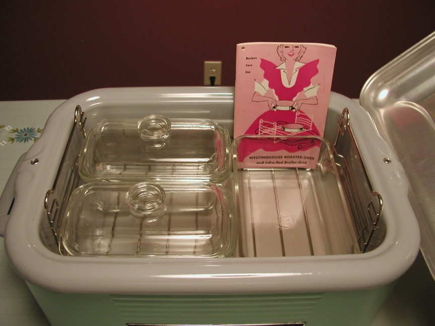 The Ultra-Deco Roaster (aka "Automeal") (Click to enlarge THANK YOU, SCOTT!!! Our devoted Consulting Roaster Guru, Roberta has these observations about the Automeal model. "... In the 1939 Automeal manual, the testimonials are "Actual statements by women users who have owned Westinghouse Electric Roasters for one year or more." Since some of them specifically use the word "Automeal" and there is no mention of that name in the 1936 manual, it seems a safe bet that this model was around at least since 1938....there were two options for the dish set: either colored or clear glass. ..." Roberta has been kind enough to scan the manual for the Automeal roaster, and you may find it in the Free Downloads section. ![]() Join Us on Facebook RO-81 Model Westinghouse Roaster (ca 1942-1948) Click to enlarge November 9, 2001: Here is a postwar RO-81 model roaster (1942-1948. It is the same thing inside, but it has some color and three lights which show whether the thing is on and whether it has reached the desired temperature. Here are some photos of an early 1950s Roaster (RO-91) and Forgee Stand that were sent to us by Randy, one of our readers from Oregon. Here's what he has to say: Hi! ![]() Model RO-91 Roaster and Stand ![]() Model RO-91 Knockout for Timer ![]() Model RO-91 Top ![]() RO-91 Model Interior RO-91 distinguished by the square faceplate Here is a VERY nice RO-81 Roaster and Stand, dating (I believe) to the mid 1940s, sent in by Beth. Note the distinctive three square buttons on the control panel. Beth writes: ![]() Beth's Roaster and Stand Here are some photos of a roaster sent in by our readers Greg and Barb. They write: We came across your site doing some research on Westinghouse roasters. We purchased our roaster on July 21, 2006 at a garage sale for $25.00! I am sending along several pictures of the roaster. It came complete cabinet with a clock timer, the dishes (with the arched tops), the booklet with recipes, and the small booklet for the timer! The timer is only missing one of the small knobs. It is in immaculate condition! ...The lady who was selling it said that she used it for Thanksgiving turkeys just a few times and it worked wonderfully. ...Incidentally, Mansfield, Ohio is about a 25 minute drive from where we live in Bucyrus. We are in Mansfield at least 2-3 times a week. My husband was saying that there used to be a Westinghouse plant in the town. It would be cool to go over and check at their library in the local history section to see just where it was located! Thanks for all the great information on the roasters! Indeed, Greg and Barb got a FANTASTIC DEAL on this complete Model RO-91! This roaster, dating from the early 1950s is really in good condition.