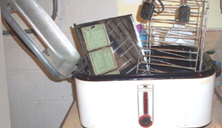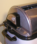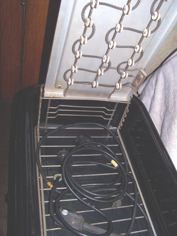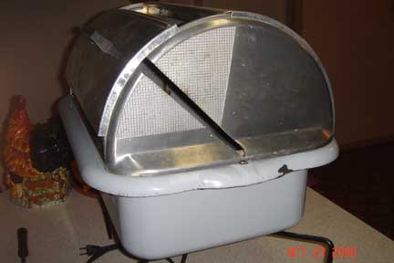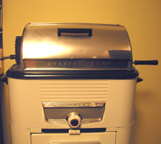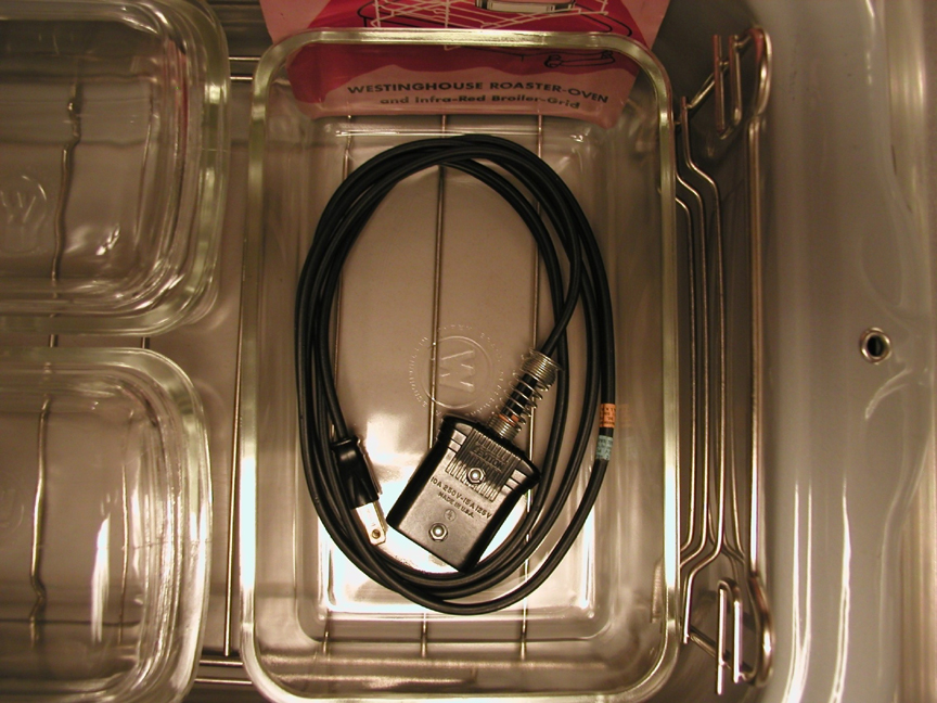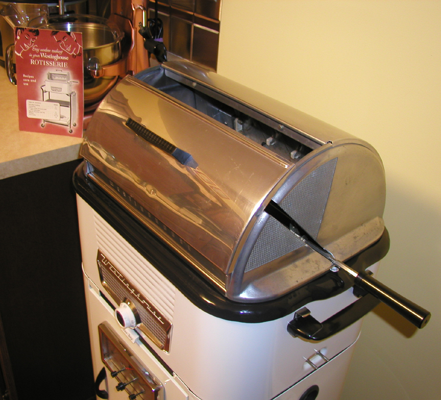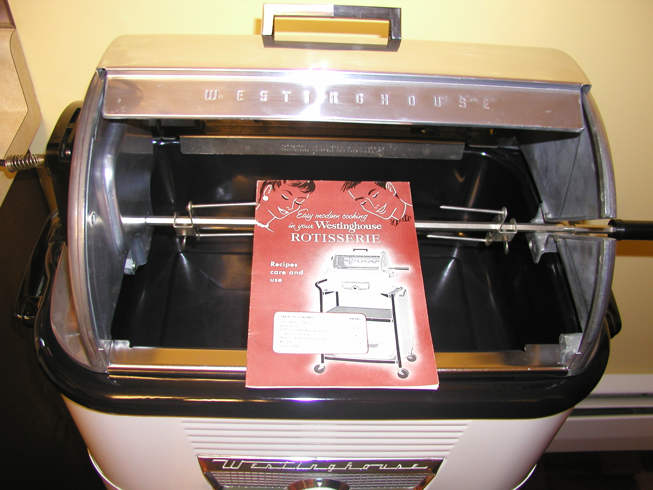 The Baking dishes are the rarest components of the Westinghouse Roaster, and hence the most valuable. Here is a lovely 1958 Roaster sent in by Cassie. This is in especially good condition AND Cassie has the very rare griddle attachment -- and it looks like the griddle is in its original packaging. It also looks like Cassie has all the baking dishes. She has "posed" her Roaster to show how the Lid Support works. When the roaster is in use, moisture condenses on the inside of the lid. If you need to stir the contents or add things, you would make a big puddle if you set the lid down. The lid support allows you to rest the lid (upside down) while you deal with the food. ![]() Cathy's Roaster and Griddle ![]() The Rare Griddle ![]() The Griddle, Mounted on a RO-91 for Use ![]() Front, Original packaging for The Griddle ![]() Obverse, Original packaging for The Griddle During the 1940s and 1950s, manufacturers sold expensive appliances on the basis that they were a Good Investment --- that is, they could perform many functions and would last forever. The Westinghouse corporation was no exception -- over the years, they modified the roaster so that it was practically a stand-alone stove. Here is a wonderful example of one of these attachments, a Rotisserie. There are more radiant heating wires inside the hood; a bird or roast would rotate below these wires and cook, dripping fat into the pan below. This adds about another 800 watts to the power draw. This appliance was not designed for a society with an energy shortage...