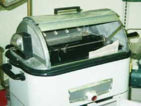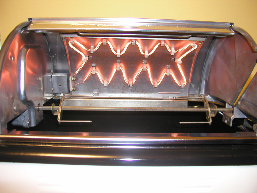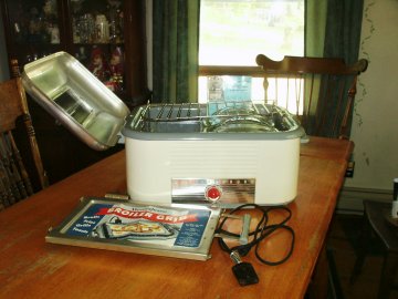 ![]() Simply Beautiful! ![]() The Timer ![]() The Glassware There is areason that the timer knob is missing --when you set the time back, you unscrew the knob. After a while, the knob becomes loose and falls off. Our reader Jacki sent in this photo of her Model RO-541W roaster and Forgee stand, and writes: "... Still in use at least once a week ..." Jacki's Model RO-541W Roaster and Stand Click to Enlarge Our reader, Raul sent us these great pictures of his rotisserie set: ![]() Front View ![]() Left Side (Motor) View ![]() Right Side View ![]() Skewer and Cord Our reader, John sent us these great pictures of his Model RO-541W rotisserie set:
