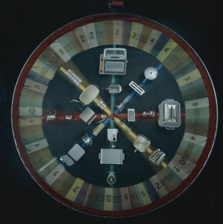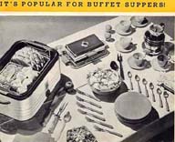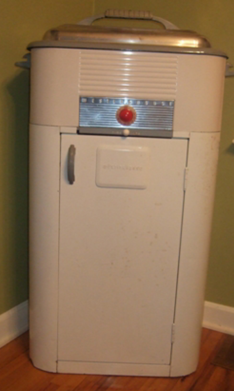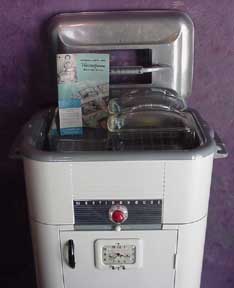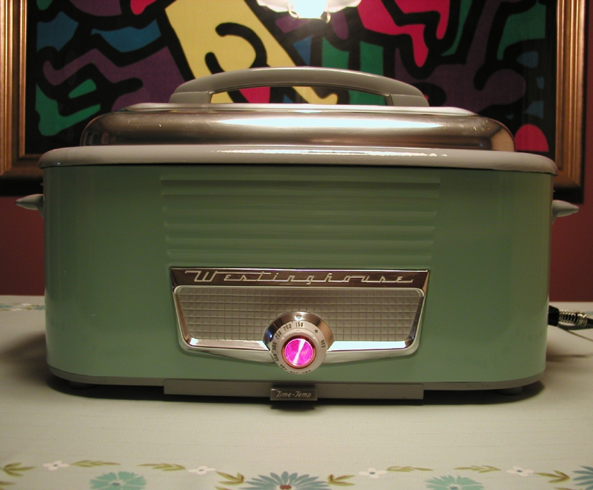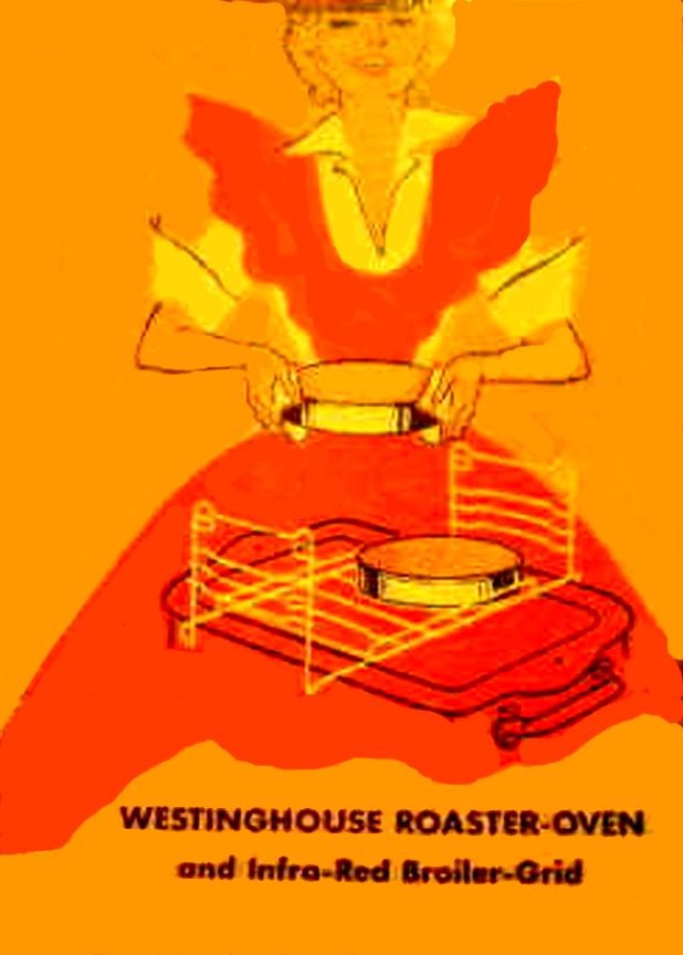 This page is part of a website devoted to swing dancing and retro culture from the 1930s through the 1950s. You may be asking yourself, "Why do they have a special page about Westinghouse Roasters?" The answer is purely statistical --- we get more mail about the Roasters than any other collectible. Further, we keep finding pictures of the Roasters and their associated support devices -- they were beginning to swamp their former category, Kitchen Appliances. We suspect the reason that we get so much mail is that the Westinghouse Roaster is a supremely durable product. There are effectively no moving parts. The things were outrageously expensive in the 1950s and were built to last. They are so blindingly simple that it is very easy to keep them running indefinitely. The downside is that they also appear to be stunningly inefficient. My version uses 1320 watts --- use this for three hours at Thanksgiving and your utility company can also have Turkey (including Istanbul) ... [that's a joke... we get lots of letters from electrical engineers on that subject. Let's just say that the Westinghouse Roaster doesn't get an "Energy Star"...] Wheel of Fortune/Appliances Click to Enlarge The Westinghouse Roaster is always included in period ads about the "ideal kitchen" -- as shown in the above photo. We have information about most of the other appliances on the "Wheel of Fortune" on out Kitchen Appliances Page, including the Pressure Cooker, the Fryryte, the C30 CoffeeMaster and the like.