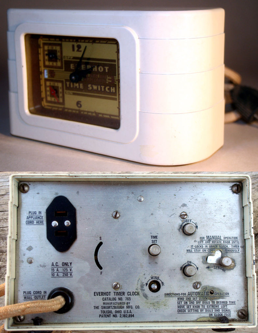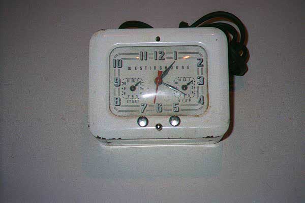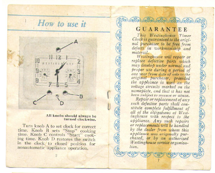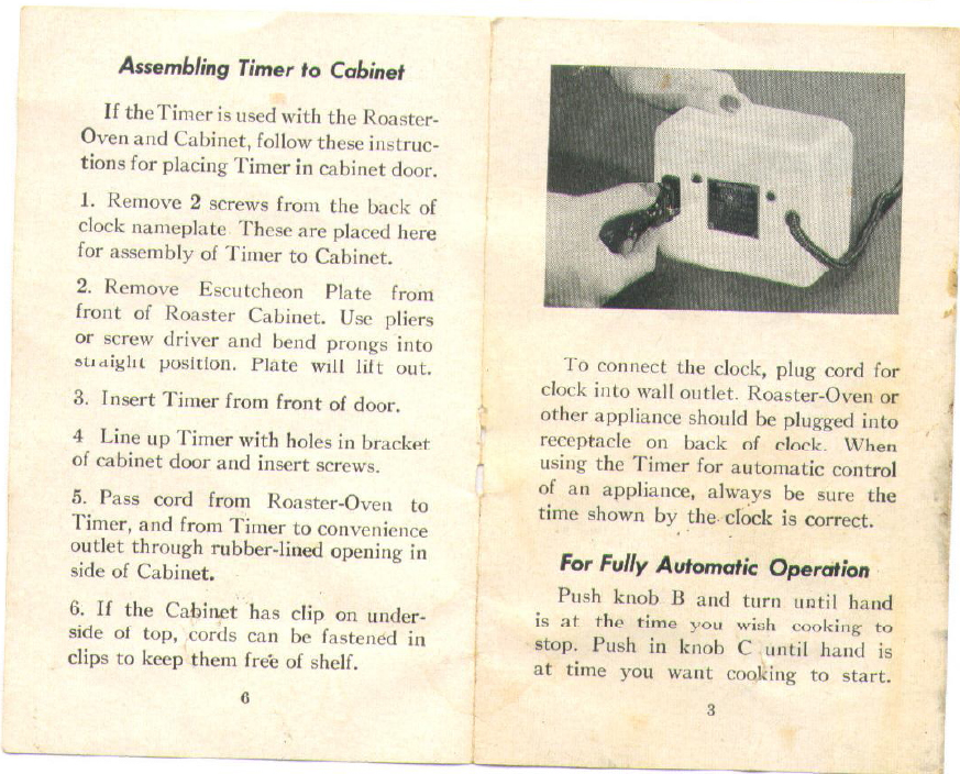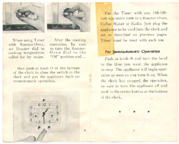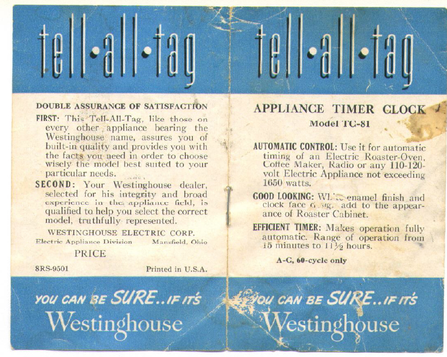We were forunate to find The Timer (left) Knockout Panel for the Timer (right) The Timer Click to enlarge One small note: the knobs that set the time are threaded and when they are turned to their maximum, they come loose. It is very rare to find a timer with all the knobs. Thanks to Darwin, one of our reader, we now have a copy of the Timer Manual. He writes: "... I like your site so much I thought I’d send you something to share with others: the Westinghouse Roaster timer clock manual for the model TC-81 timer clock. My sister loaned her vintage roaster to me for the Thanksgiving turkey and I became curious about it. Eventually, I came across your website for the Westinghouse Roasters and learned that her roaster and stand, model R0-541 was manufactured around 1950. And you know what? After 59 years, it will still roast a turkey with the best of them. ... Here are the pages (out of order) for you to enlarge and print directly -- or you can Click Here to download a copy as a ".pdf".