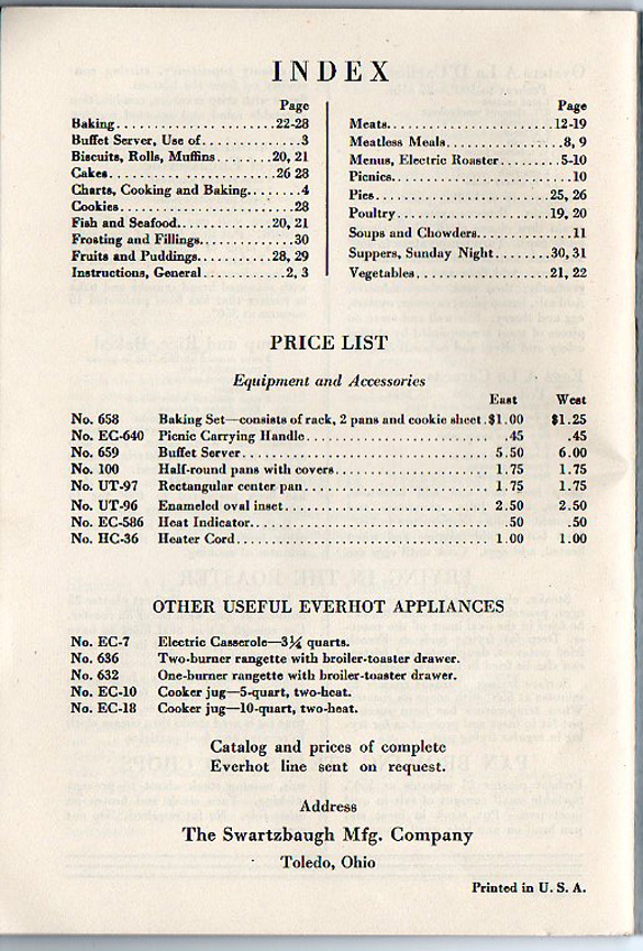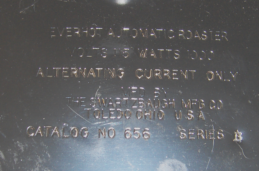 Details of the Swartzbaugh Company Click to Enlarge Alas, after the War, the Swartzbaugh folks fell victim to McGraw Edison and ultimately to the depredations of the Bersted Company, known for cheap, cheesy Drug Store Appliances. And, the lovely Art Deco styling of the roaster slowly vanished. Andrea not only sent us photos but also the Manua for the Everhot Roaster.