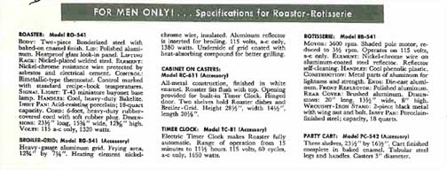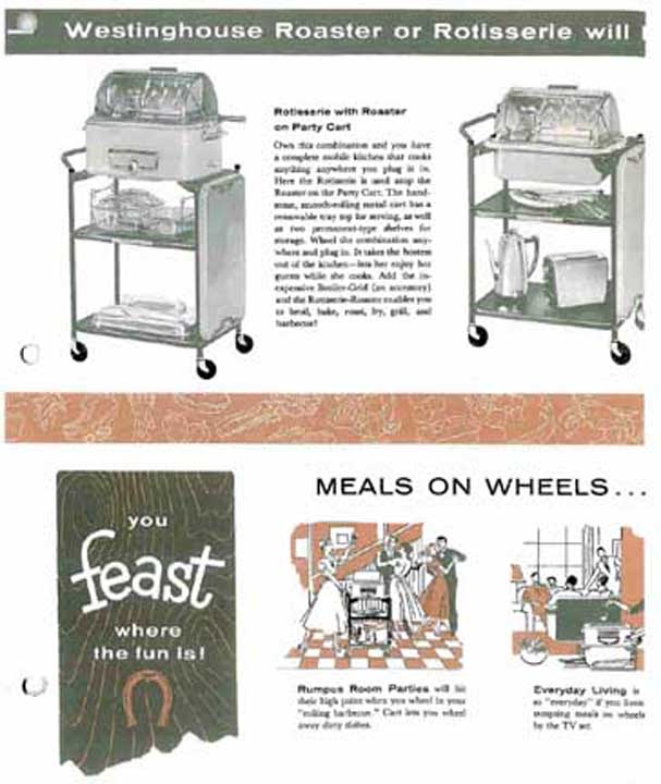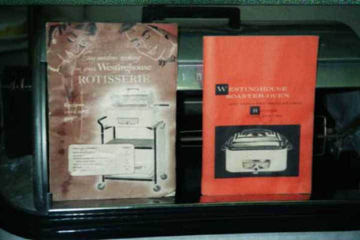 The Rotisserie Attachment Shown on a RO-541W (left to right) Advertisement for the Rotisserie Attachment Cart for the Rotisserie Attachment Manuals for the Rotisserie and the Roaster Click to enlarge It could be used with the Roaster (left) or with a "Dummy" Well Pan (right) More precisely, this is the Automeal roaster that was probably made sometime between 1938 and 1940 We got this note from Scott Schaut, Curator of the Mansfield Memorial Museum (Mansfield was the site of the Westinghouse factory where the Roaster was made) Scott writes: "... I commend you on your web site and the information that is available. One you your bolggers said that they lived close to Mansfield and was going to see what was at the library on Westinghouse. Unfortunately they hardly have anything. I have been collecting Mansfield factory items for the past 13 years. Between the Museum and my personal collections we have amassed a great deal of material on Tappan, Dominion Electric and of course Westinghouse. "...I also have the original Westinghouse Robot "ELEKTRO", that was made here in Mansfield for the 1939-40 New York World's Fair. I just purchased that last remaining archive files of Westinghouse which date from the 1930's through the 1960's. "...I also bought with the file collection a Westinghouse Roaster. It is high deco with a black and silver stripped exterior and a beautiful silhouette of a woman. (I have never seen a woman and turkey on a platter on any other roaster) It also included the original cords and the broiler griddle and instruction manuals. It is called the Deluxe Adjust-O-Matic Roaster Grill. If you and your readers would be interested in photos and other material I can over time copy them and send them to you. I hope that you enjoy them. . ..."