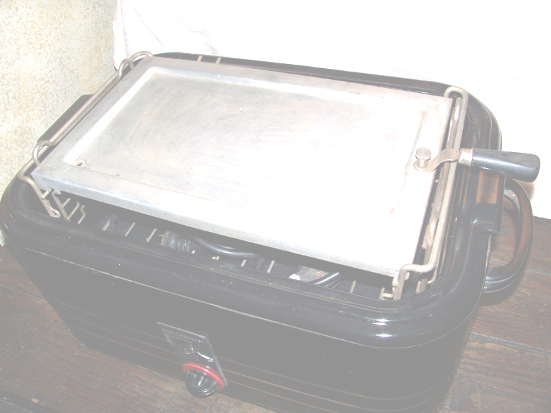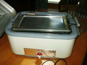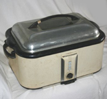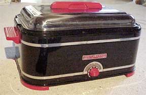 Here is a photo from one of our readers who has THREE roasters! ![]() This home really appreciates the Roaster! Here is a Roaster owned by reader Russell. Here is the information on the base Plate: Cat. No. RO-81 115 Volts 1320 WattsMansfield, Ohio Made in the USA Alternating Only H154878 Russ wants some help in dating this Roaster. This is a Model RO-81, distinguished by the row of three square buttons. They were sold during the period 1945-1948. Since appliances were not made during WWII, it is conceivable that this could have been designed in the 1930s.