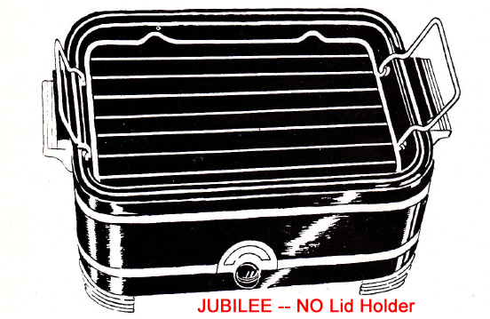 John's Pink (Model RO-541P) Roaster We love the Table and the art in the background... (click to enlarge) Here is a lovely 1936-1938 "Jubilee" Roaster sent in by the newest addition to our "Roaster Roster", the celebrated 40s Phil of Indiana. This is the earliest roaster that I have seen and those red handles are just awesome! Roaster fans all over the world are drooling, Phil! ![]() Phil's 1938 Roaster In March, 2011, Roberta found a Model RRA-4, which is the downscale version of the "Jubilee".