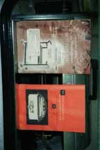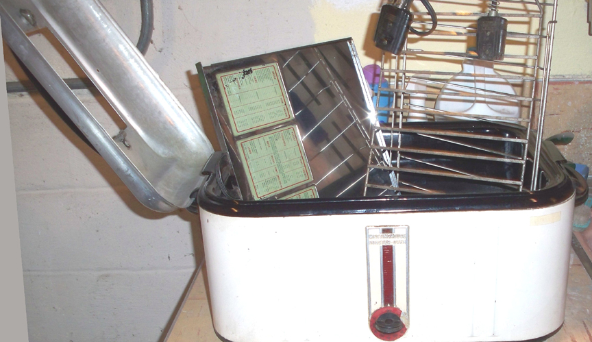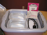 He has all the requisite glassware... (click to enlarge) Recently, John acquired a PINK roaster in marvelous condition. He sent us these wonderful phoptos and writes: "... There’s a date noted on the manual of “July 10th, 1959” in a woman’s writing style. Sadly, someone cooked something in it without the inset pan in so the inside of the Roaster has been scrubbed. Not an uncommon fate as for in the earlier Roasters cookbooks, they actually spoke of how to do that for large birds. The inset pan would then be inverted and used as the top cover. It would rest on pins that stuck out of the roasters base. I had two of the three dishes that match what it originally came with, none were with it at auction. It’d be really sharp were it not for that and the grey inset pan itself having many chips. This one runs about 25 degrees over (hotter) than what it’s set at. I’m going to tinker with my scrap (parts) oven for some sort of calibration ability. I had to hand paint back in the “Time-Temp” stencil on the pull out drawer ..."