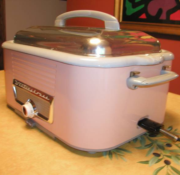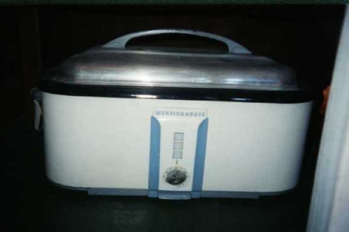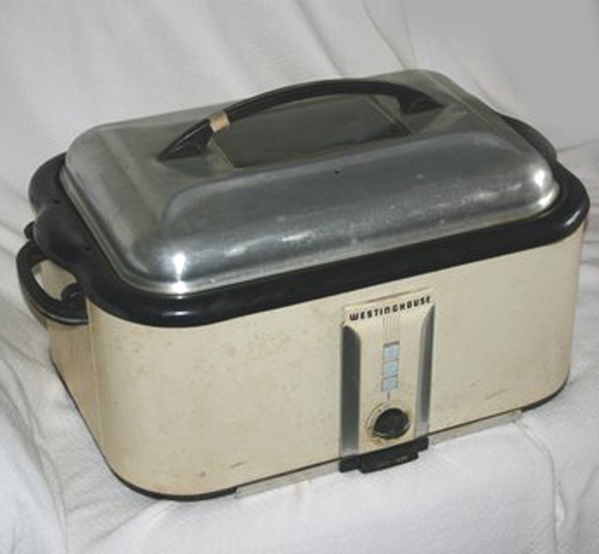 Westinghouse Roaster Advertisements (l. to r.) 1946, 1947, 1950, 1954 Click to Enlarge Above are a few more ads for the Roaster from 1946-1954 Click here if you are looking for parts. If you are seeking to get a valuation for your roaster, Check this source If you have broken the glass in the lid: Only tempered glass will work. Go to a shop that specializes in glass and have a piece made to the specific size for the roaster; after the glass has been cut to size, the glass shop will temper it so that it may withstand the heat of cooking... this will be expensive... With all its faults, I still love my Westinghouse Roaster. It occupies a proud place in my kitchen! ![]() The Famous Westinghouse Roaster June, 1999: This is a Westinghouse Roaster Oven (Model RO-541W) and its associated Forgee (4G) stand/cart. This has a special memory for me. Early in the 1950s, my Mom and her sisters chipped in to buy one of these for my grandmother. As I recall, this must have been quite an expense because I can remember the comments my Dad made when he heard the amount. My guess is that this was more expensive than a TV set. I certainly remember Betty Furness touting the virtues of this appliance on TV. (I always wondered why my Mom didn't parade through the kitchen in an evening gown...) Most families used this as an auxiliary oven, especially during the holidays. My personal memory is that the thing was used to make lasange for Sunday dinners (like about 25 people...). Also, on Christmas eve, the oven was used to keep Zeppole (sort of like doughnuts, but better) warm. Thus, it was with a wave of nostalgia that I seized upon the opportunity to buy one of these remarkable devices. The fact that both pieces were only $5 (at a rescue mission in Winchester) served only to reinforce my decision. Roaster Identification ChartWestinghouse made kitchen roasters from 1936 through the 1960s. Thanks to Roberta, our Consulting Roaster Guru, we have been able to prepare this chart of the various models and the approximate time that they were in the marketplace. Westinghouse Roaster Identification Chart Click to Enlarge Since most of the records of the Westinghouse Company have long vanished (see below...), these dates are indeed "approximate" based largely on manuals and print ads. Don't bank on our assignment of dates... Roberta (AKA "Adriana Monk") points out the differences in the lid-holders on the various models: