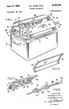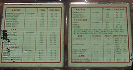 Westinghouse Roaster Patents Exterior Design Patent D115,168 Heating Mechanism and Controls Patent No. 2,156,215 Broiler-Griddle Patent No. 2,156,216 Rotisserie Patent No. 2,795,183 Click to enlarge We had to go to a hot rod specialty store to find a special epoxy high heat gloss white paint to refinish the rusted exterior. However, the visit paid a bonus in that we were also able to find a matching grey color to refinish the bottom. The paint took five days to cure between coats. (NOTE: this is an insulated exterior wall -- see the note at the bottom about "High Heat" Paint, particularly if you are thinking about using this trick on a Stove Top) We were successful in restoring the roaster to its original glory. We celebrated with Lasagne --- as I watched the electricity meter speed up into overdrive. For those with interest in the technical details, here is the a photo of the manufacturer's nameplate: ![]() Manufacturer's Data, Typr RO-541W Courtesy of Jamie and Alan Myers Here is the Text PC 541 115 Volts 1320 Watts Westinghouse Mansfield, Ohio Made in USA Alternating Current Only 3222940 ![]() Roaster with the Indicator Light "ON" ![]() The "Time Cooking Chart" Courtesy of our friend Betty in Charlottesville, Va