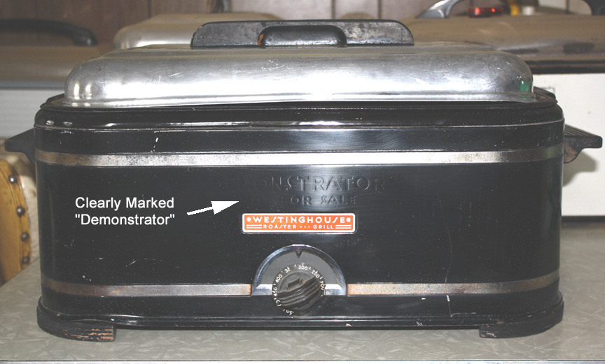 Roberta's Model RRA-4 Roaster Click to Enlarge She writes: "... Thought you might like to see this interesting little piece I came across...I think it's basically the same as the one with red handles that 40's Phil has, except that the handles aren't red. (And it's a bit battered...) The Model Number is RRA-4, and it's only 1150 watts. Also a little smaller than the later Roasters, possibly 16 quart like the Westinghouse "Standard" Electric Roaster. What's that? You say you didn't know there was a 16-quart Standard model? Neither did I, but I've founds some interesting documentation (See below). Another antiquated feature on this oldie is that the feet and handles are wood. You can see, stamped right into the sheet metal on the front, that this particular one was a "Demonstrator" and was not intended for sale, so I'm not sure if the "real" ones had wood or plastic (bakelite?) handles. (Phil's red-handled beauty certainly looks to have plastic handles and feet, though I suppose that could just be a fancy paint job.) Sadly, this one doesn't seem to power up; I didn't leave it plugged in long, but I didn't detect any heat. Could be that, as a Demonstrator, it doesn't have all the internal workings. Or some of those workings aren't. Working, that is. Or the cord is bad, and, since the pin spacing is closer than on the other Roasters, I haven't got another cord to try it with. I may have to do an autopsy to find out what's going on. Regardless, I'm happy with it - makes a great showpiece, and I certainly have enough working Roasters for all my Roasting needs. ..."