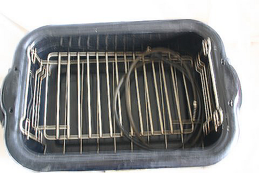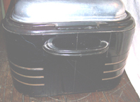 Russell's 1940s Roaster (click to enlarge) Here is a nice letter from one of our readers who didn't realize what he had. He was about to throw away a fairly rare 1940s roaster that may even be older than the one Russ has. He writes: "... was really looking for the glass that was broken on thanksgiving day...Did not realize it was so old!We did do a 20 pound turkey in it , and was cleaning up when the glass fell out and broke into 1000 pieces.... Is it worth anything to anybody,or do I put it out for the trash ..."
