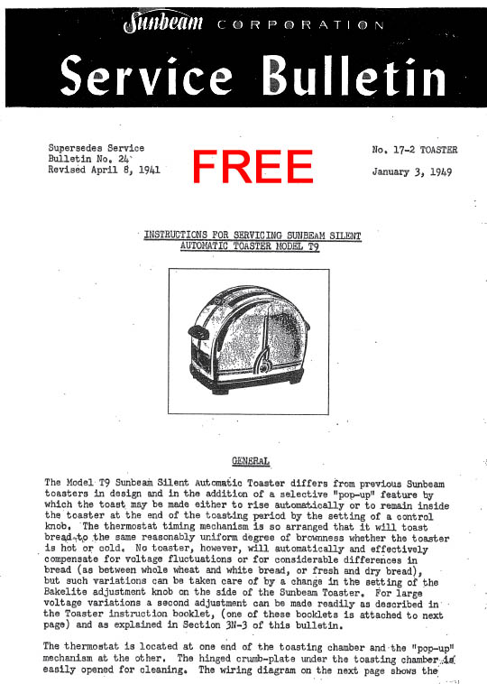 ![]() End Views Click here if you want to learn how to get Free Patent Drawings Of all things, the Chinese company that owns the Sunbeam name has reissued a heritage model toaster that sort-of resembles the T-9, except that it is made out of a cheesy metal that is definitely not chrome. Sunbeam Model T-9 Service ManualFree Download The T-9 Service Manual, c. 1949 Click to Enlarge Through the good graces of our reader and friend Alvin K, we have acquired a copy of the official T-9 Service Manual. We are very pleased to make this available to you at NO COST. Enjoy this with our compliments. Sunbeam Model T-20![]() Sunbeam Model T-20 Automatic Toaster We found this for $4 in Manassas The Toaster has a beautiful chrome body with incised deco design and bakelite base. It's automatic beyond belief! No levers to push -- no popping or banging. Just drop in the bread and the Sunbeam turns on the current and lowers the bread silently. When perfectly toasted, the current turns off and the toast comes up silently. ![]() T-20 Design Patent No. 2,667,828 Click to Enlarge Click here if you want to learn how to get Free Patent Drawings With "Radiant Control", the toasting is always the same no matter what kind of bread you use. The heat radiated from the surface of the bread activates the exclusive thermostat. That's why you always get the same uniform golden toast you want whether the slices or moist or dry, cold or warm, thick or thin. ![]() Above, is an ad for the T-20 which appeared in the early 1950s. These were very popular as wedding gifts when it debuted in 1949. Slots are a little wider than usual. Made in United States America, Sunbeam Corporation, Chicago, U.S.A. Toronto, Canada., 110-120 Volts, 1275 Watts General Electric Models T77 and T31