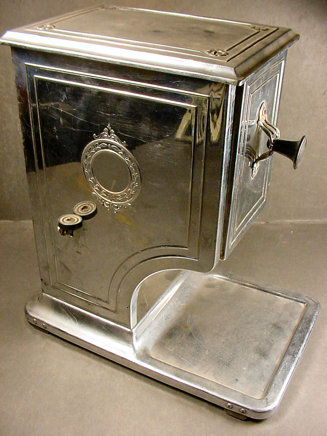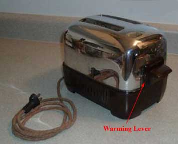 The Unusual Plug Arrangement If you buy one, make sure that you get this! Click to Enlarge "Toastmaster" is a registered brand name for the Walters-Gentner Corporation. It is a clever play of words, and since Walters-Gentner got there first, they prevented Sunbeam from offering a toaster in their "...master" line (i.e the "Mixmaster","Ironmaster","shavemaster", etc, etc. Toastmaster 1B3![]() Toastmaster Model 1B3 This is the Toastmaster Model 1B3, a lovely toaster in heavy chrome. This is part of a whole class of toasters made by the Walters-Gentner Corporation using a clockwork mechanism that was patented by Murray Ireland in 1932. The toaster embodies all the classic elements that made "popup" toasting a cultural icon. Due to the size of the mechanism, these toasters were asymmetric -- there was a toasting side (i.e electrical resistance wires) and a popup side. Toast goes into the slots and a lever is depressed. This lowers the toast, switches on the heating element, and compresses the spring on the clockwork timer. Depending on the setting of a "doneness lever", the clockwork "ticks" off the fractions of a second, turning a small gear. When the gear reaches a particular point, it trips a lever and releases the toast basket. The compressed spring forces the basket upward, carrying the toast up and beyond the heating element. The sound of the release ("ka-ching") is part of the lore of popup toasting. The Model 1B3 has an unusually quiet timing mechanism and you have to listen very closely to hear the clockwork operating. ![]() Early Toastmaster Models are Asymmetric ![]() Top View Highlights the Popup Mechanism Section on the Left ![]() Murray Ireland's Patented Clockwork Popup Mechanism, Patent 1,866,808 ![]() "Toastmaster", the Trademark of the Walters-Gentner Corporation On the Clockwork Side ![]() The Non-Operating Lever on the Toast Side ![]() The Footplate and Crumb Tray Walters-Gentner also made a one-slice version of this toaster. Here are some photos of that particular variant: