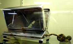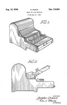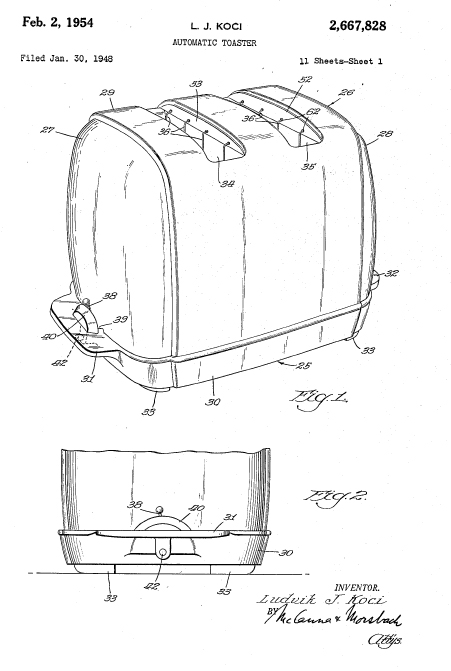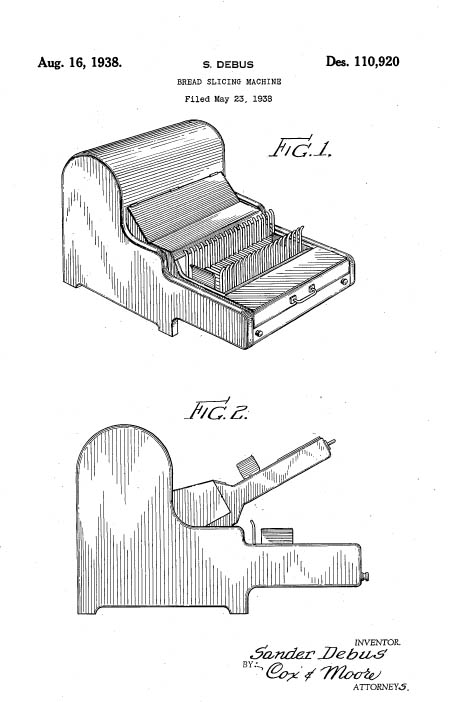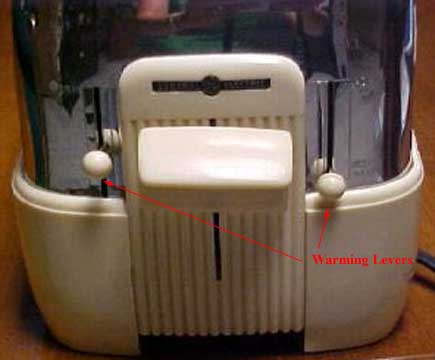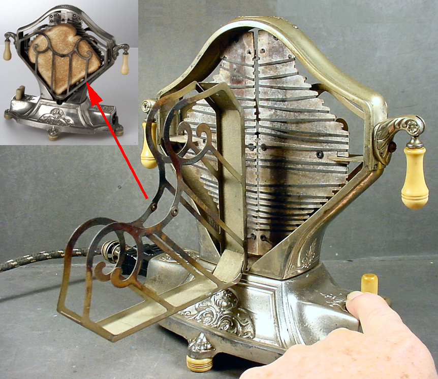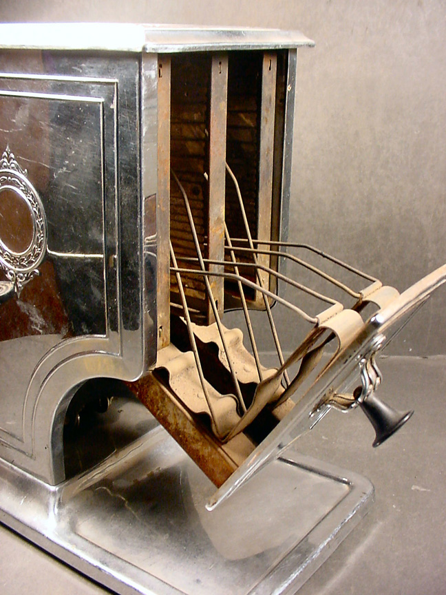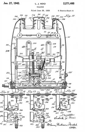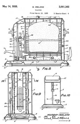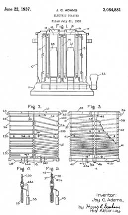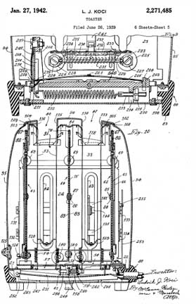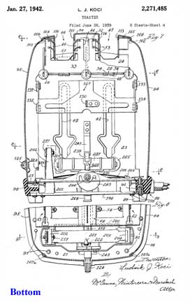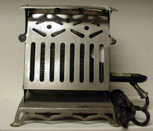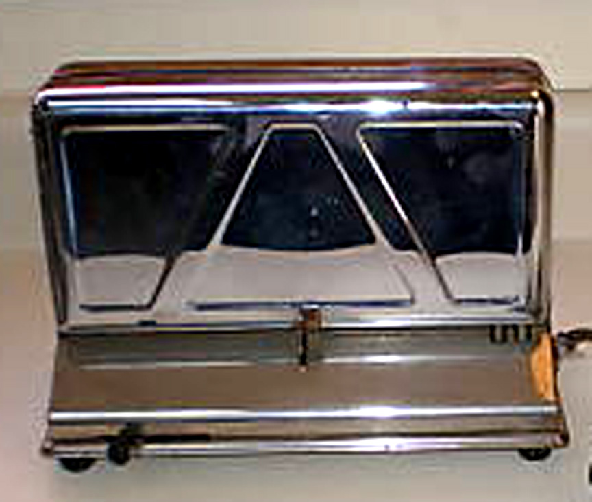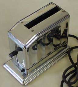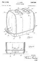 Behold - The Bread Slicer Bread Slicer Design Patent D-110,920 Click Photo to Enlarge It The commercial bread slicer really hasn't changed a whole lot since the 1930s -- the slicer on the left was in a 2009 catalogue. Toast-O-Lator Check out our complete restoration of a Toast-O-Lator. Click here Here is a wonderful photograph from the mid 1940s showing a display of appliances at a Sears store in Chicago. Many of the toasters are described below and the coffeee makers can be found on our Coffee Paraphernalia Page. Toasters and Coffee Makers Galore at Sears, c. 1946 Click Photo to Enlarge It Early toasters were definitely NOT automatic -- all they did was substitute electrical resistance heat for the heat from a fire or stove -- you were responsible for turning the toast and taking it out when it was done. Most of these had some sort of door or lid that had to be opened to turn the slice of bread over so that it could be toasted. It is for this reason (and the fact that they were mostly sold in the 1920s) that I call this genre the "Flappers" -- you had to be on your toes to "flap" the door open. These were made from 1915 to well into the 1940s. Here's a design for a "flapper" made in 1938: ![]() Flapper Toaster Design Patent D-110,139 David Chapman for Knapp-Monarch Click to Enlarge The Steelcraft "Coathanger"This bare-boned toaster is owned by our friend "Acme Ron" in Phoenix. He comments, "... I don't think Underwriters Laboratories would approve. ..." ![]() The Steelcraft "Coathanger" Toaster from the 1920s The Sunbeam Model No. 4This is a nice little toaster that looks like a modern sandwich grill -- the toast is prepared in a horizontal heating area.