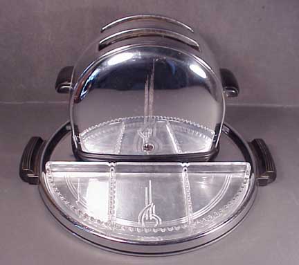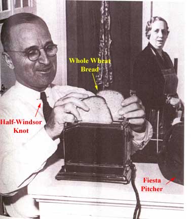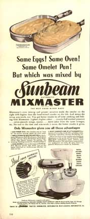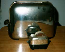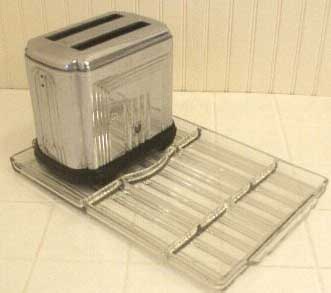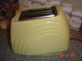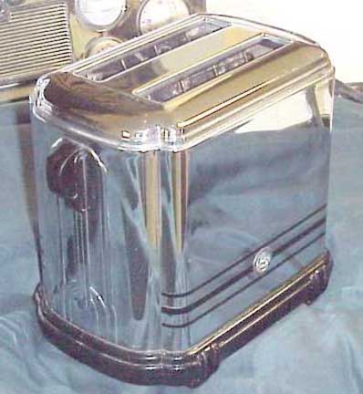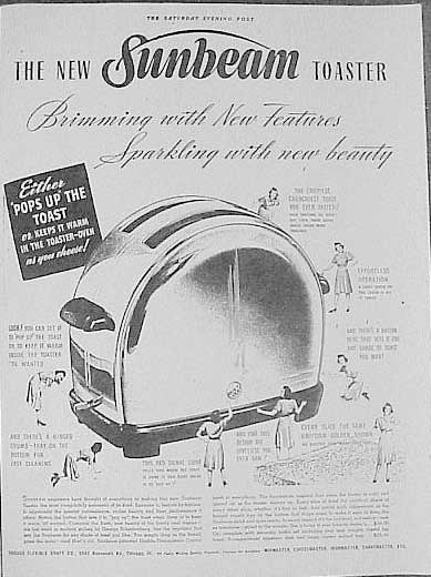 Removing Crumbs from the 1B3 Click Either Photo to Enlarge It It turns out that the Model 1B3 traveled in pretty refined social circles. Apparently, the 1B3 was good enough to attract the attention of none other than Harry S Truman. Here is a photo of Harry toasting some whole wheat bread, possibly fantasizing that he was putting General MacArthur into the thing. Harry had great taste and style -- note that he also had a Fiesta pitcher and that he has used the very fashionable Half-Windsor knot for his tie. His wife Bess looks on, probably thinking: "Well he can't do anything about the steel strike or Korea, maybe he can make toast..." ![]() Harry Truman Makes Toast with his Toastmaster 1B3 ![]() Frank Makes Toast with his Toastmaster 1B3 I Couldn't Resist Re-staging the photo. (See below for more on Harry Truman) ![]() The Patent for the Collar Pin Being Worn by Both Toast-Makers Designed by Joseph Shaulson of Providence, Rhode Island Click here if you want to learn how to get Free Patent Drawings Recently, I got the following note and photo from, Eric A. Murrell editor of the Toaster Collector’s Newsletter – The Saturday Evening Toast.: "...George Waters the grandson of the founder of Waters-Genter credits this hospitality set with the success of Toastmaster throughout the 30s. He said that the appliance stores usually lined up the toasters of the various manufacturers side-by-side and when the 1B-3 was shown on the hospitality tray, space was created between it and its neighbors. This made it stand out amongst its peers and a legend was born..." Toastmaster 1B3 Hospitality Set Thanks, Eric Click to Enlarge It Toastmaster 1B5![]() 1930s "Toastmaster" Model 1B5 two-slice automatic pop-up This is an absolutely wonderful early example of a pop-up toaster. This little gem works perfectly and it is absolutely immaculate --- not a scratch on it! I got it in Ellicott City; if you turn it over, you will see a serial number for the toaster. This is a dead giveaway to value --- in the very early years, the number of toasters being manufactured was low, so they could actually put an individual serial number on each machine. When these were mega-mega mass-produced, serial numbers became impractical. Here's what Toaster Central has to say about the Model 1B5: "'Cheek to Cheek' by Irving Berlin topped the charts and '42nd Street' was running on Broadway when Toastmaster produced this stunning architectural design with that could have been a Busby Berkeley set! It has a clockwork timer that ticks with settings from light to dark. Remove the bottom cover for crumb extraction. The Model 1B5 was produced from July 1934 until June 1936 by McGraw Electric Company. " Here's the details from the Manufacurer's plate: Waters-Genter Div MPLS MINN USA Mod1B5 No. B 506634 Toastmaster 1B14![]() The Toastmaster Model 1B14 With Novelty Salt Shakers Click to Enlarge This is the toaster that set the standard for Toasters. This is the famous "Flying Toaster" of the "After Dark" screen saver that was the rage in the late 1980s. Think of a toaster and the Toastmaster comes into your mind. This is a particularly good example of the species because it is one of the very first models, made by McGraw Electric a predecessor of Sunbeam. These things were the definitive wedding gift of the 1940s and 1950s and are in good supply, although "First Editions" like this are scarce. These made a good wedding gift because they are made to last a lifetime! Appliances and marriages have declined in durability since the Toastmaster came on the scene. The Toastmaster Model 1B14 is shown along with a novelty salt and pepper shaker that was inspired by its big brother. The white slice is salt and the whole wheat is pepper. They pop up, too... Sunbeam T1![]() Sunbeam Model T-1 Toaster This is the Sunbeam T-1 D made in 1936. This two-slice toaster is automatic but not pop-up. When the toast is done, the toasting panels turn off automatically. It uses a bimetal timing mechanism rather than a clockworks hence the name "Silent Automatic." The beautiful chrome body with bakelite handles sits on an ornate bakelite base. It features a faceted glass jewel set in the front that glows orange when the toaster is in operation This photo was sent to us by Ron, who also included a photo of the T-1 in his mother's kitchen, sometime in the 1950s. Ron writes: "...They are usually listed on Ebay as not working because people think they pop-up when they don't. It was like a waffle iron, when the red light went off, you raised the toast up by hand..." ![]() The T-1 in Ron's Mom's Kitchen ![]() Complete T-1 Presentation Set (with the Toaster) Our friend "40sPhil" sent us two very nice photos of his model T-1-C variants ![]() ![]() Phil's T1C Variants The exterior of the Model T1C was designed Alfred F. Fukal of Chicago, Illinois. Mr. Fukal was an employee of the Chicago Flexible Shaft Co., the corporate parent of Sunbeam. Mr. Fukal applied for his design patent on November 19, 1935 and it was granted (as Des. 98,247) on January 21, 1936. ![]() Mr. Fukal's Patent Des 98,247 Click here if you want to learn how to get Free Patent Drawings Sunbeam Model T-9![]() Sunbeam Model T-9 Toaster This is the very famous Sunbeam T-9 Toaster, possibly the most popular model ever made. The lines etched on the front and back of the toaster are symbolic of the 1939 New York World's Fair. The T-9 was issued in that year and used this device to tag onto the popularity of the event. Click Here for the results of a poll in which appliance collectors rated the T-9 as the most desired antique toaster. The T-9 was immortalized by Norman Rockwell in his October 30, 1948 cover for The Saturday Evening Post, as shown below The October 30, 1948 cover of The Saturday Evening Post Click Here to read about the Douglas "Kitchen-Master" Chairs Click Here to read about the Silex Vacuum Coffee maker We also have this in from the fabulous 40s Phil of Marion Indiana: "... Here's a little known '