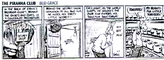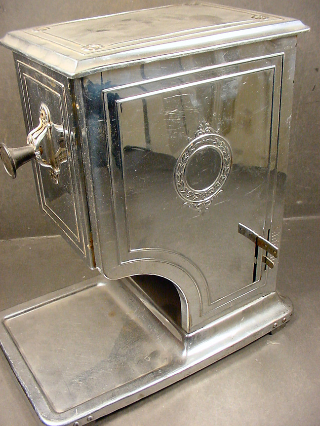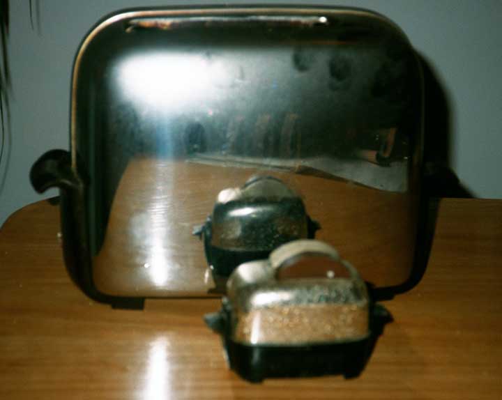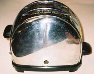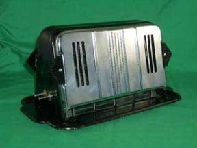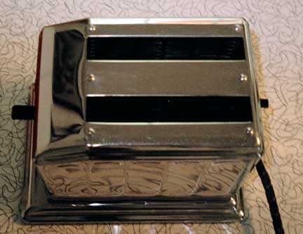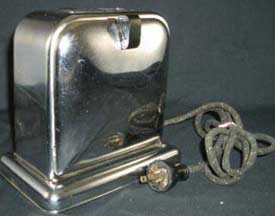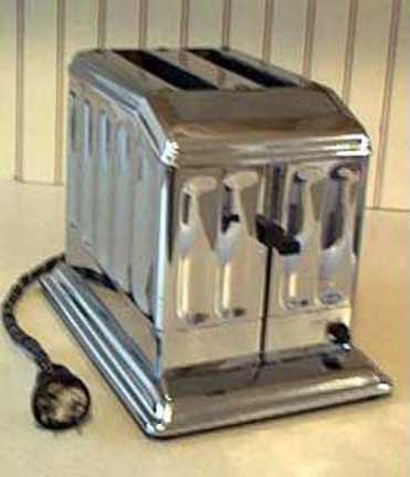 ![]() ![]() Knapp-Monarch "Flapper" from the Early 1930s This toaster was patented by Mr. Ernest Johnson in 1930 ![]() Knapp-Monarch Maker's Mark ![]() Mr. Johnson's Patent 1,756,784 Click here if you want to learn how to get Free Patent Drawings Manning-Bowman FlapperHere is a manual toaster made by the celebrated Manning-Bowman Company. This probably illustrates the widely cied axion, "The last days of old technology are better than the first days of new technology." This is a very nice chrome toaster that has the form of the new "pop-up" models that were quite the rage. However, it is just another variant of the "flapper" ![]() Ad for a Manning Bowman Manual Toaster The VictorianAt the other end of the quality scale is this four-slice version of the "flapper" that was made by the Bersted Company of Ohio. Bersted made low-cost appliances by cutting out "nonessentials" and using lower grades of materials. Their products were sold in high-volume retail outlets and are known as Drug Store toasters. They are rare because they did not last very long, hence people junked them and few are left for us to examine. This type of thing is for serious toaster collectors only. Alas, when Manning-Bowman went out of business, their designs were bought by Bersted and reissued in apallingly cheap versions. If Bersted was in the TV production business, they would be making reality shows. Nobody ever lost money underestimating American popular taste.
