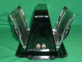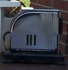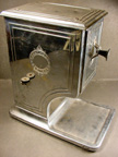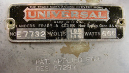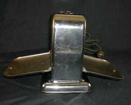 The Dangerous Fan The workroom fan has prosaic black steel blades Note "hot wiring to terminals on the rear Click Here to see a video of this fan in action Click to Enlarge The GazelleThis is one of the most desirable toasters. It was made by General Electric under their "Hotpoint" brand. It is probably the ultimate in manual toasters and the lovely gazelle on the front is a major Art Deco Icon. Thanks to our friend "Acme Ron" in Phoenix for sending this in. ![]() The GE Hotpoint "Gazelle" Toaster The Universal "Lux" Model E7732This is an unusual toaster that is just on the "cusp" of manual versus automatic operation. In this (large) toaster, a clockwork mechanism causes a "toast drawer" to flamp open when a predetermined amount of time has passed. This is basically a "flapper" with a timing mechanism. The thing had to be heavy because the flopping toast chamber might tip the thing over. These photos also come from our good friend "Acme Rone" Heberlee of Phoenix. Ron has this to say: "... The black lever will to open it manually, other side has the timer (missing knob) and a light/dark setting. It pops open when done. It is 11 inches tall and weighs 7 pounds! Must have cost a bundle..." This is an Automatic toaster that is operated by a Lux timer (similar to a kitchen egg timer) For your edification, the Lux Products Corporation was originally founded in 1914 by Paul Lux as the Lux Clock Manufacturing Company. It was based in Waterbury, Connecticut and produced only clock movements at that time. In the years that followed, the company grew and began making the entire clock unit. Lux Clock produced clocks until 1941, at which time they made war related products. Clock production resumed after the war, and in 1954 a plant was established in Lebanon, Tennessee. In June 1961, the Robertshaw-Fulton Controls Company, a leading manufacturer of thermostats and controls, bought out the Lux Clock Manufacturing Company. In July of 1932 George Anderson and Fred Juengst was granted a design patent on the Universal E-7732. The Manufacturer's Plate