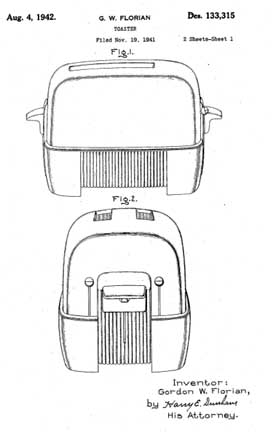 G.W. Florian's Design patent for the GE T77 and T31, D-133,315 Click here if you want to learn how to get Free Patent Drawings The "T77" (in brown Bakelite) and its close cousin the "T31" (in white Catalin) were sold by General Electric. They incorporate the vast bulk of knowledge about popup toasters that had been accumulated to date. They offer separate controls for lowering and keeping toast warm, but this feature was already on the T-9, so GE was not breaking any new ground.