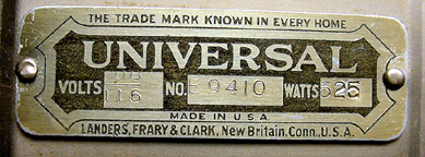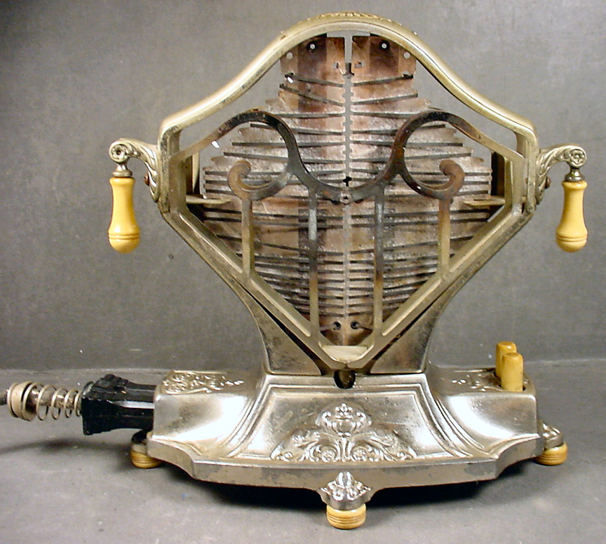 ![]() ![]() The Bersted "Victorian" (Model 66) The SweetheartPossibly the most beautiful toaster from the "flapper" era is the Universal Sweetheart (Model E-9410), manufactured by Landers, Frary and Clark. These lovely photos come from our good friend "Acme Rone" Heberlee of Phoenix. Ron has this to say: "... This is the embossed 9410 model. the 9411 was plain. First one I have seen that has all the Bakelite intact and works. Push the button down, the cage swings halfway to insert or remove bread; let go of the button and it returns flipping the bread, or is it half toast now......my granddaughter loves to ask people 'What do you put in a toaster?' ..." In May of 1929 George Curtiss was granted a design patent on the Universal E-9410 with its easily recognizable diamond and ear ring pattern The Manufacturer's Plate