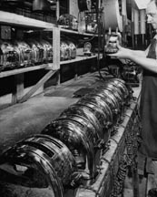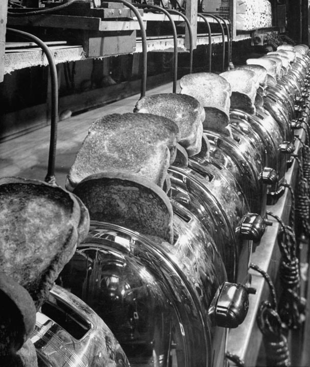 ![]() Matching Ads that Ran on facing Pages in the October 6, 1941 issue of LIFE Magazine read About the Mixmaster on our Kitchen Mixers Page Here are some photos from a 1946 article in LIFE Magazine showing T-9 Toasters on the Sunbeam Assembly line. Apparently, each toaster was subjected to a "reality test" by actually toasting bread.