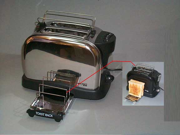 Doug's Collection of Toasters Thanks a lot for passing this along, Doug. We want to thank our reader Neil Gould of Hong Kong who writes: "... thought you might like to know that this is the first Toast rack integrated into the toaster. I patented it 5 years ago..." ![]() Here is Neil's Toaster-With-Toast-Rack Remember, Toasters are for BREAD!. Read about the Flaming Pop Tart Experiment before you put any foreign substances into your beautiful T-9!!! Here's a fellow who managed to put his entire computer inside a GE Toaster; The CD drawer comes out of the Toast slot... | |||||||