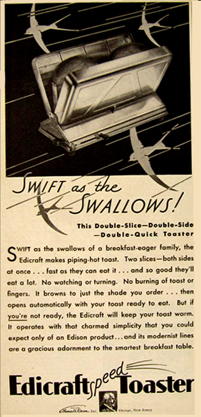 The Landers, Frary and Clark Model E-7732 Lux Toaster Anderson and Juengst Toaster Design Patent D-87,297 Click to Enlarge Click here if you want to learn how to get Free Patent Drawings The Edicraft Clamshell ToasterIn 1887,Thomas Edison built a research laboratory to be devoted to the "rapid and cheap development of inventions." Eventually, about 200 scientists, engineers, and technicians were employed there to invent to order, “useful things that every man woman and child wants… at a price they can afford to pay.” The "Edicraft" line came close to fitting this paradigm -- it was developed in the late 1920s when electric appliances were a growing industry that generated high profits. The "Edicraft" line included a clamshell type toaster [below], a sandwich grill, a waffle iron, a combination grill/waffle iron and a coffee urn/water heater (the “Siphonator”.) The entire line was of high quality but were expensive, on the order of $25 per unit -- equivalent to $800 in 2011! The Edison Company stopped production of appliances in 1934. Edison died in 1931, at age 84, but his company, Thomas A. Edison Inc., remained in business until 1957 when it became a subsidiary of McGraw-Electric.