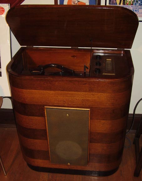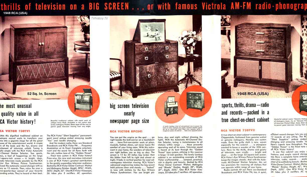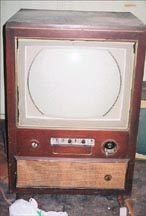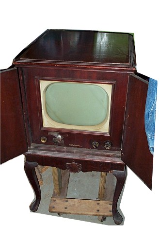 Ultra-Rare RCA Console Click to Enlarge One of our readers sent us this photo of an RCA television that is supposedly quite rare. He writes:. "... Wasn't sure but thought you might like a picture of a television that should be the only one left. It was purchased in 1948 by my parents and they were told by the dealer they bought it from that they had a recall because of a weak leg. My parents decided to keep the television. The dealer told them there were about 365 made and all but 5 had gone back on a recall. This seems to be one of them. There are missing knobs and the back is missing. It has a bad resistor that we could not find years ago but other than that it is a neat looking set. It is solid mahogany and now has that weak leg so I have stored it for years off the legs to preserve it... As I remember my parents referred to it as the Queen Anne model if that would help. I have been trying to figure out what to do with the set for years and recently found a mueseum in Ohio and one in Canada but just have no idea whether they are in it for themselves or not. Hopefully I will find a long term home for it one day..." His parents were right -- the cabriolet legs (they look like they have knees) certainly mark it as the Queen Anne style. | |||||||