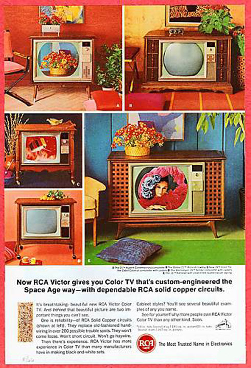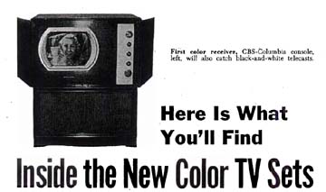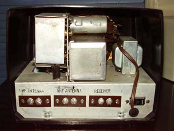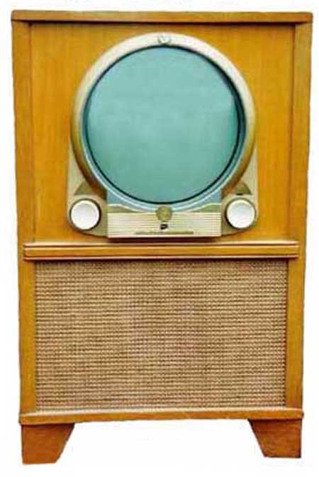 Posted July 31, 2002 Very early 21 Inch Color TV The RCA 21-CT-55, a 21 Inch Color Television made in 1955. Why is this significant?? In the early 1950s, two competing color TV systems emerged. CBS proposed a system which transmitted an image in each of the three primary colors sequentially. A wheel with segments of red, green, and blue rotated in front of the camera, while a similar wheel rotated in front of the television screen, synchronized to the one at the camera. The advantage of the system was that it was inexpensive. Eventually, the wheel at the receiver could be replaced with a tri-color picture tube when the cost of these tubes came down. Unfortunately, the system was not compatible with the black and white standard. This was an astoundingly complex mechanism. You can read about it yourself in an article from the August 1951 issue of Popular Science. ![]() Click the Photo to Read the Article The other system was proposed by RCA, and was eventually adopted by the FCC. It used no mechanical parts, and was compatible with black and white sets. For a few months, test broadcasts were done using the CBS system. Some manufacturers, such as Admiral, made sets for the CBS standard. Later, the FCC adopted the RCA compatible system. The first color television sets for this system were sold in 1954. They used a 15 inch screen. Later that year, 19 inch sets were made, and by 1955 all sets were made with a 21 inch picture tube; The RCA 21-CT-55 is one of these. Several manufacturers made 15 and 19 inch sets, most in very small quantities. The first set was made by Westinghouse, and sold for $1295. RCA introduced the CT-100 a few weeks later, at a price of $1000. GE sold its 15 inch set for $1,000, Sylvania's cost $1,150. Emerson rented color sets for $200 for the first month and $75/month thereafter. By the summer of 1954 there was already a shakeout. A headline in the New York Times said "Set Buying Lags - Public Seen Awaiting Larger Screens, Lower Prices". Motorola and CBS promised a 19 inch screen at $995. In 1955, Raytheon introduced a 21 inch set for $795 and CBS offered a trade-in of up to $400 for their black and white sets towards the purchase of a $895 21 inch color model. The 21-CT-55 came out in 1955 and cost $898. RCA Victor started production of the 21-CT-55 on December 1, 1954. RCA released the 21CT55's service literature, "1954 No. T13", on November 24, 1954. RCA also published a Television Service Clinic booklet, "Technical Features of the RCA Victor Model 21CT55 Color Television Receiver". To quote from it: "The RCA Victor Model 21CT55 color television receiver is a direct-view console which reproduces high-quality television pictures in full color from a standard color television signal, and automatically, with no adjustment or attachments, high-definition black-and-white television pictures from a standard black-and-white television signal. The picture displayed on the screen of a 21-inch tricolor kinescope, the 21AXP22, has an area of approximately 255 square inches (2 1/2 times the prior year's 15 inch CT-100). The 21AXP22 employs electrostatic focusing and electromagnetic convergence. Ultor voltage is 25,000 volts. In conjunction with the 21-inch tricolor kinescope, the convergence and purity arrangements provide ease of adjustment, and increased accuracy and stability of color registration. One of the customer convenience features in this receiver is that convergence and focus are no longer customer adjustments from the side of the cabinet but are internal and are preset by the service technician. Additional features include: a removable top panel to facilitate servicing and adjustment, and the location of most of the functional controls at the receiver front. These control are located under the tilt-down control cover or behind the removable wood panel directly below the control cover. Dual loudspeakers are provided for sound reproduction." By the end of 1957 only 150,000 color sets had been sold. Click here to look at another type of collectible, or keep on scrolling for more Televisions. | |||||||
