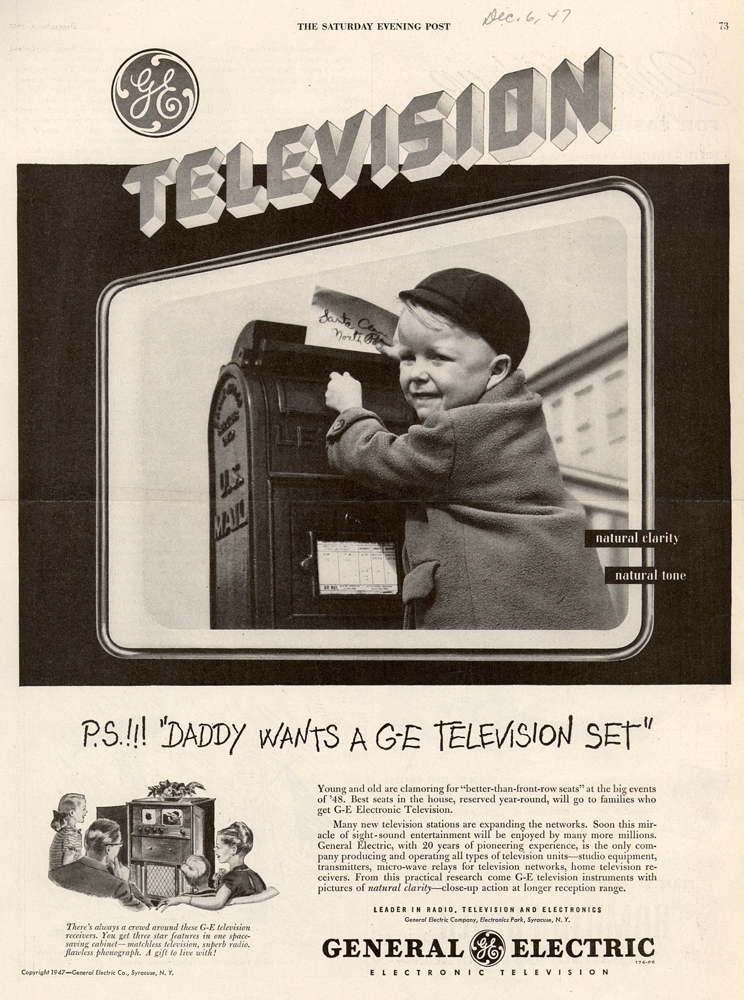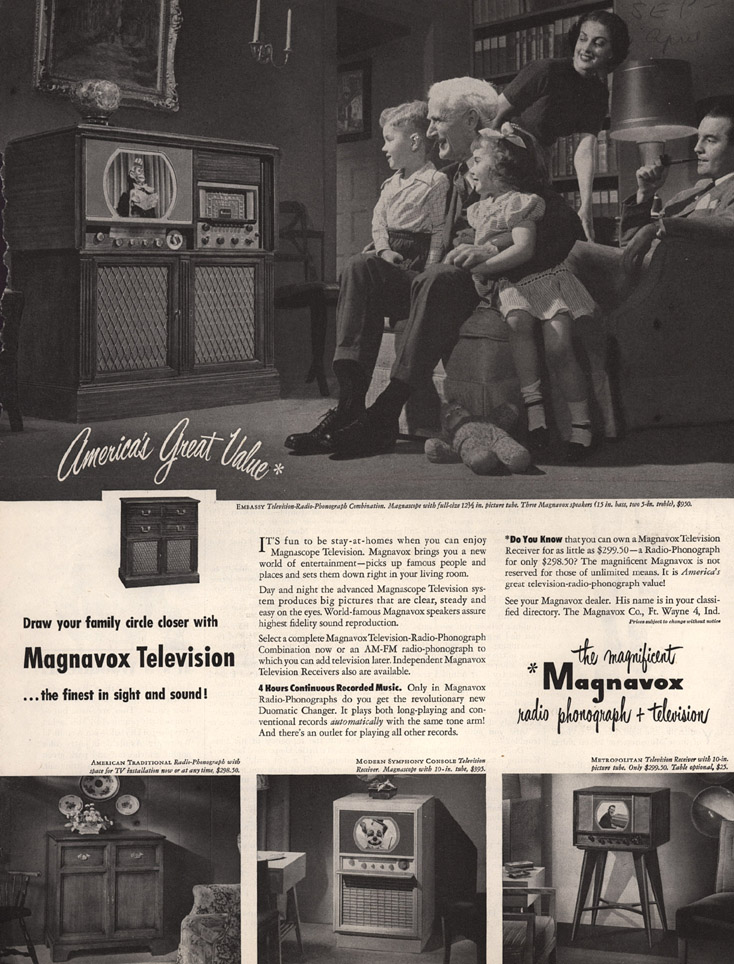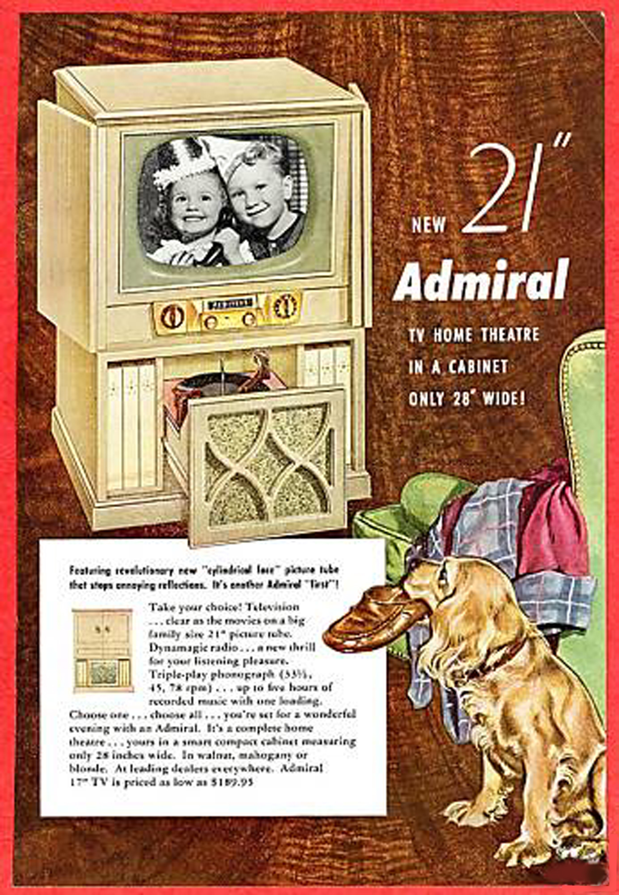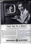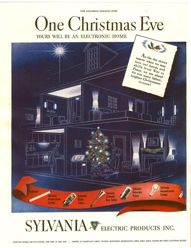 SO -- the wife comes home, sees the vendor on TV and the husband with a bottle of beer. She asks incredulously "Where did you get that [bottle of beer]" The husband says that he got it from the refrigerator. The joke is the wife's misperception of Television -- something that could only be funny in 1946... ![]() Ad for Sylvania Tubes "Just wait until after the war when all these amazing things will be around..." From The Saturday Evening Post December 9, 1944 This ad from Sylvania promises that the Post-WWII future will include a TRK-12 in the Living Room. Click here to look at another type of collectible, or keep on scrolling for more Televisions. | |||||||