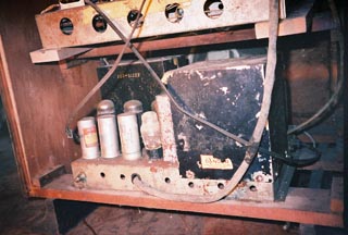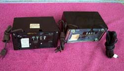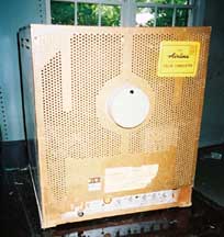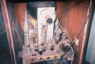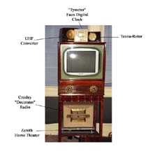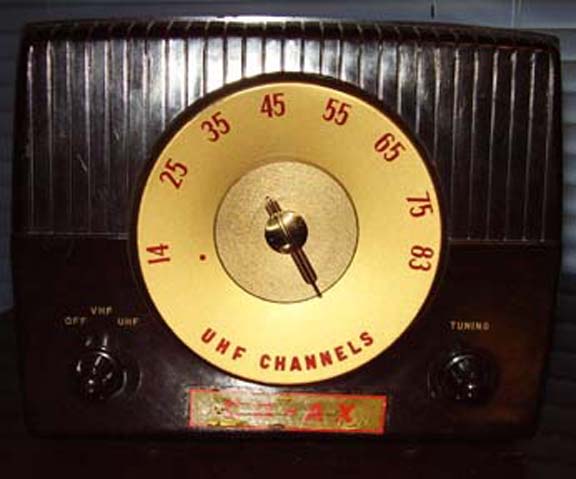 Posted July 3, 2002 Airline Television We just discovered this marvelous artifact from the early 1950s. It seems that our friend Carl Kirtley bought a house that had been condemned. It had been uninhabited for many years and the owners were sort of "Packrats". This is an understatement. When we peered into the house, we felt like Howard Carter and King Tut's Tomb. These people never threw a thing away from 1940 through 1990. There are three complete kitchens -- the cabinets and appliances were not discarded, but simply moved to the basement. No doubt, you will see many things from Carl's Treasure House. The first items to be "rescued" are electronics, which had to be relocated to my workbench for testing. This is a television from about 1951. It is the Airline brand, which was distributed by the Montgomery Ward Company. This is going to be the first full scale TV that I have worked on, so it is going to take a while. The internet is relatively dim with respect to Vintage Television, so you will learn along with me. At the moment, I can tell you that the cabinet is actually solid mahogany! No veneer -- real mahogany! The Airline TV sat in a corner of the workshop from 2002 to the Spring of 2006, waiting in vain for a new picture tube to materialize on e-bay or at the shows. No such luck. So, regretfully, I did the next best thing. I carefully preserved the innards (minus the broken picture tube...) and refinished the case. Then I put a brand new Panasonic television inside the case. The remote even works through the speaker grille. I even refinished a little table to match the TV. The newly "restored" set went into the bedroom until I found a pair of drive-in movie speakers at a yard sale. After looking at the speakers for a while, I thought that it would be interesting to display them in the bedroom. (Those of you who actually went to Drive-Ins in your youth will understand this). The, an ad stuffed in the Sunday Paper heralded the fact that Circuit City was selling a Zenith DVDPlayer/Home Theater system for about $90. I went to the store and they had an open box Zenith that they sold me for $50 because it was missing one speaker. I planned to use the Drive-In speakers as the rear Left and Right. It was fairly easy to rewire the innards of the Drive-Ins and to put brand new speakers inside. (Any good 4" speaker will fit just fine.) When I took the Zenith speakers apart, I found that they were junk, although the subwoofer was serviceable. I had LOTS of better speakers around the house --- inside some of the radios that I planned to restore. So, the five speakers in the Home Theater System are actually inside old radios that are cleverly distributed around the room. Here's what the final setup looks like: The Airline TV in Its 21st Century Configuration Click to Enlarge You will note that some additional equipment has been added to the basic TV -- much in keeping with the evolution that took place during much of the 1950s. The Television Set had been TOO EXPENSIVE to throw away (early ones cost the equivalent of two months wages for the average working man). Thus, as technology changed, it was necessary to add some "peripherals." In the late 1950s, the thirteen VHF channels were not enough to supply the demand for television programming. Thus, short wave users were booted off the air and 99 Ultra High Frequency (UHF) channels were created. The FCC mandated that all new television sets be wired to tune in UHF signals, but those with sets made before this ruling had to buy a UHF Converter as shown below. This was simply connected between the VHF antenna and the RF input on the main TV, as supplemented by a small loop UHF antenna.