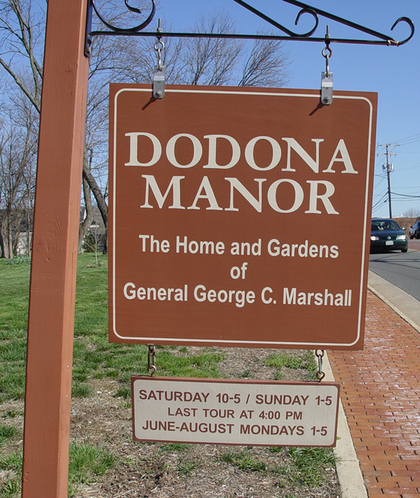 General Marshall and Dodona Manor General of the Army, Seretary of State and Defense, Nobel Laureate, radio collector... Click to Enlarge From 1941 - 1959, General Marshall and his wife lived at Dodona Manor on Leesburg, Virginia. The house was constructed in the mid-1820s for John Dirsh. The house soon passed into the possession of the Ball family, who added an addition. There is evidence that the building served as a female boarding school in the 1850s. The Marshalls bought the house in 1941 and lived there until 1959. It was declared a National Historic Landmark in 1996 and is open for tours. General Marshall had a 1947 10 inch TV from General Electric.