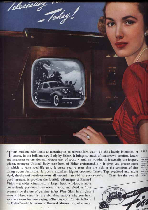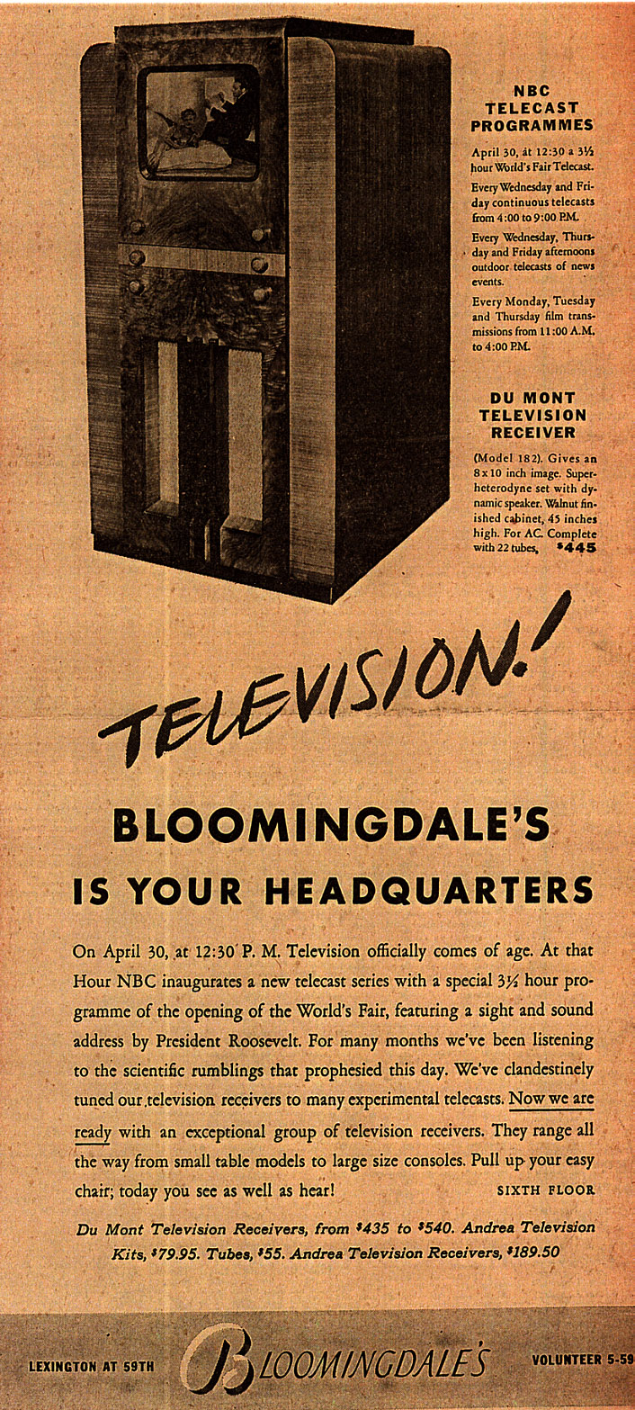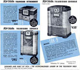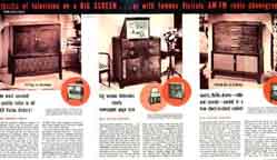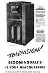 ![]() Relative Economics of Television in 1939 Click to enlarge either photo Here are a few more 1939 ads for competing products. On the left, you'll se an ad for GE televisions showing the thrill that could be brought to a boy's life by TV (at the time, most programming was, in fact, sports events. Since the ad appeared in Fortune, it is most likely targeted at the guilt of executives too busy to spend time with their son. In the center, you'll se a 1939 ad for Buick cars that shows the product being advertised on TV. This is of some interest since the FCC did not allow commercial broadcasts until late in 1940. GM had either astounding foresight or extreme faith in their lobbyists. Finally, on the right is an ad for TVs at Bloomingdales, certainly a high-end merchandiser. Bloomies is selling DuMont sets, which are discussed below. Since they were virtually hand-made, we expect that they were priced somewhat higher than the RCA models.