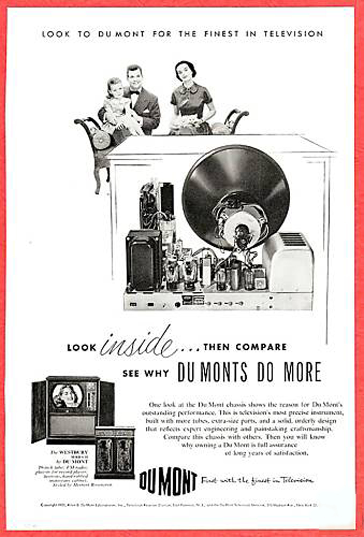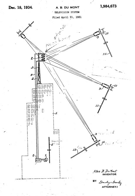 The DuMont Laboratories Representative Patents Alternative Projection TV Patent No. 2,446,214 DuMont Television System Patent No. 1,984,693 Click to Enlarge By 1947, DuMont had the beginnings of a television network, with stations in New York, Washington and Pittsburgh. Because of his partnership with Paramount Pictures, the FCC refused to permit DuMont to acquire more stations. To survive, his network relied on innovative strategies. In 1947, with "The Small Fry Club" DuMont established television's first children's program. "Captain Video and His Video Rangers," an outer-space adventure, also became hugely popular. It was on the DuMont Network that comedian Jackie Gleason developed the format for ''The Honeymooners,'' the classic 1950s series that was later broadcast by NBC. And here, reporter Mike Wallace first aggressively questioned public figures on the air. DuMont pondered how to counteract successful competitors like ''Texaco Star Theater,'' starring Milton Berle. Rather than offer another comedy, the DuMont Network aired Bishop Fulton J. Sheen's ''Life Is Worth Living,'' a religious show that developed a loyal following. In 1952, the Dumont Network aired professional football and basketball, but in time, lost out to other networks that could afford to pay more for the television rights. Eventually, DuMont was forced to sell his stations, but the DuMont Network's legacy in programming remains an important chapter in television history.