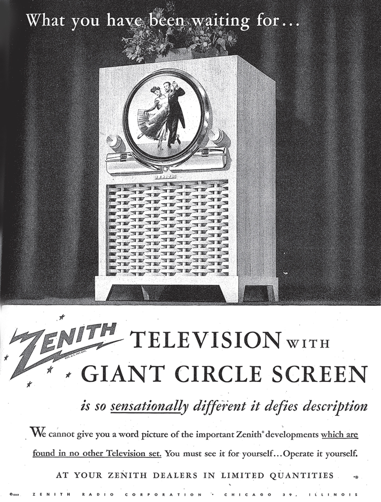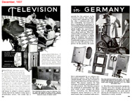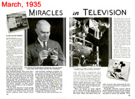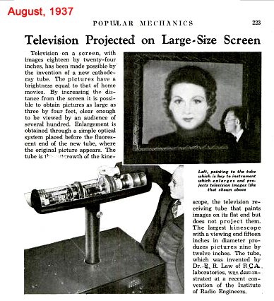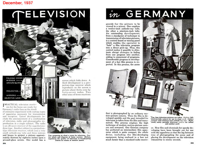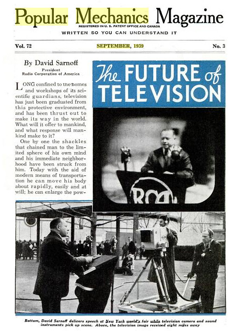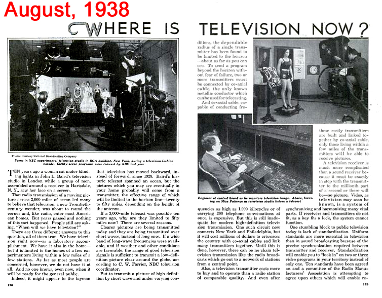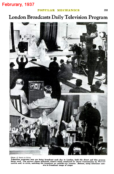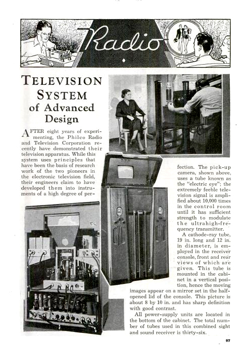 Future of Television (left) from Popular Mechanics March, 1935 (middle) from Popular Mechanics August, 1938 (right) from Popular Mechanics September, 1939 Click to Enlarge Television was available in the US, but somewhat later because it used an all-electronic process developed by Philo Farnsworth (see below). Vladimyr Zworkin invented a similar process and the two dueked it out in the courts. Farnsworth won the credit for inventing electronic television, but the financial muscle of RCA ensured that the Zworkin system would be used -- and it was used until analogue TV was abolished in 2009.