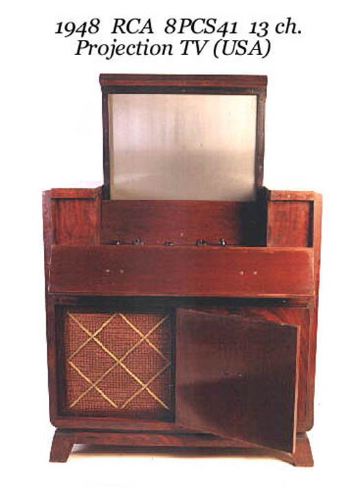 ![]() Social Context for Television in 1939 Click to enlarge either photo By 1948, RCA had worked out a fairly sophisticated optical system to project an enlarged image onto a ground glass screen. This model, the 8PCS41 series was only sold for a short time as the market was moving to larger CRTs rather than projection systems, largely because the projected images tended to be washed out in normal room light.