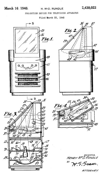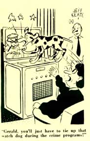 The RCA 8PCS41 Projection TV System Patent No. 2,438,022 Bottom: Theater projection system Click to Enlarge Never Say Never... One of my readers sent this cartoon, taken from a 1947 book called Addams and Evil. So, now there are two cartoons with a projection TV... ![]() I have shown this to a few people and they don't get the gag at all, so here goes.