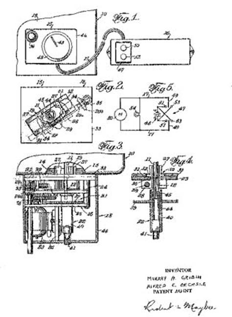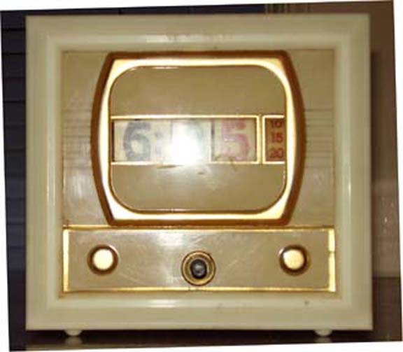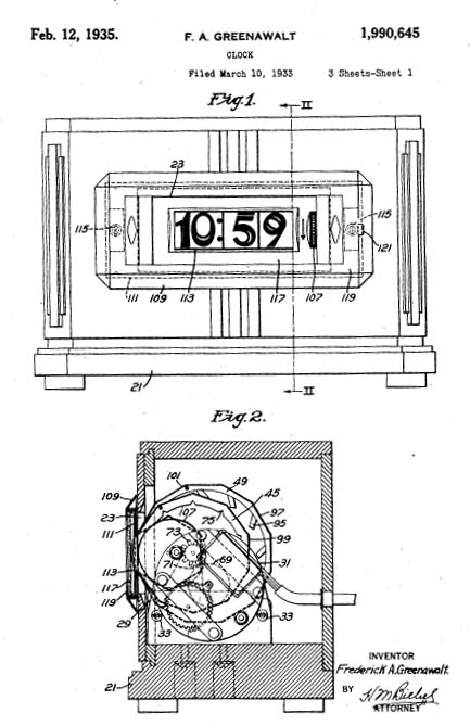 The Tenna Rotor Patent Diagrams Canadian Patents 497534 and 636446 Click to Enlarge The final "modern accessory" wasn't so modern at all -- it was a "Tymeter" faux digital clock. This was invented in 1935 by Mr. Frederick A. Greenawalt, for which he received US Patent 1,990,645. It was marketed under various guises by the Pennwood Numechron Company of Pittsburgh, Pennsylvania. However, this nifty little model with a face that looks like a Television set really took off, and soon it was de rigeur to have a Tymeter to keep up with the Joneses. This model has a light AND it glows in the dark! A sticker on the back indicates that it was made in October 1957 at the height of the fad.