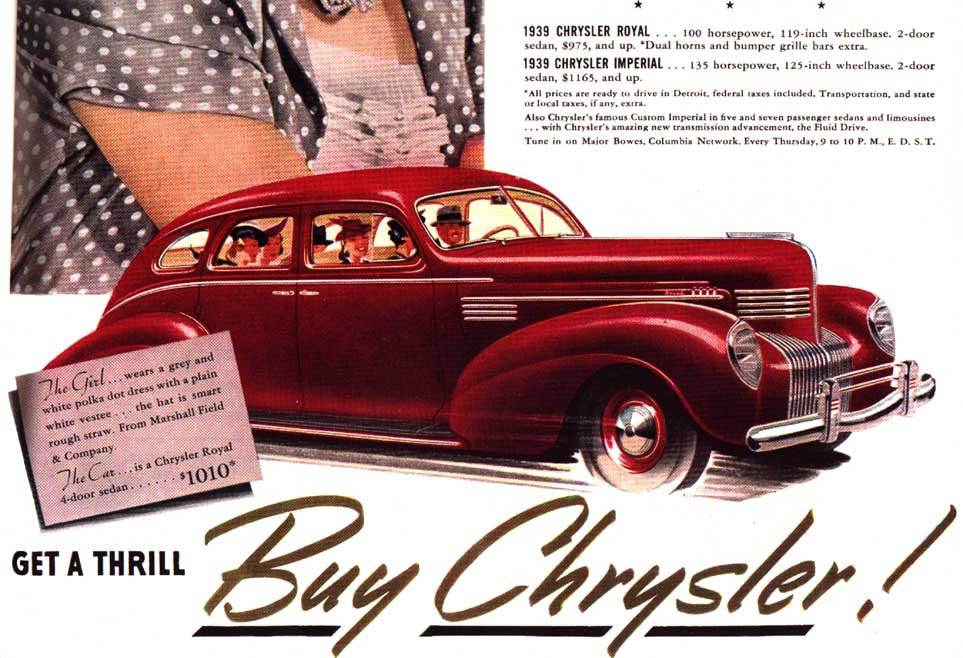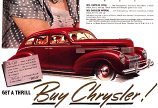 ![]() More Advertising for the RCA TRK Series TT = Television Top ? Click to enlarge either photo On the subject of economics, below you'll find an article on Televison from the a 1939 issue of Esquire. The piece was written by "Ranger" who would be the equivalent of the magazine's high technology geek today. It is noted that the price of a TV receiver ranges from $100 to $1000, depending on features. To give you an idea of what $1,000 would have bought in 1939, we also show an advertisement for the new Chrysler automobiles -- the Chrysler Royale was priced at $1,010. Today, a modestly equipped Chrysler M-300 would cost about $30,000, so you can see that TV was reserved for the upper classes only.