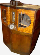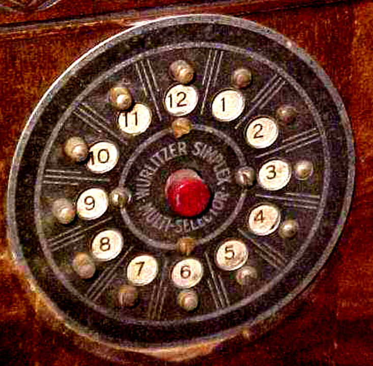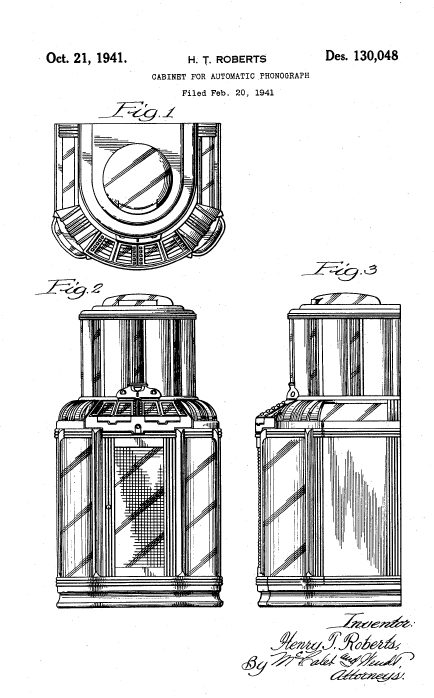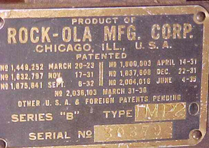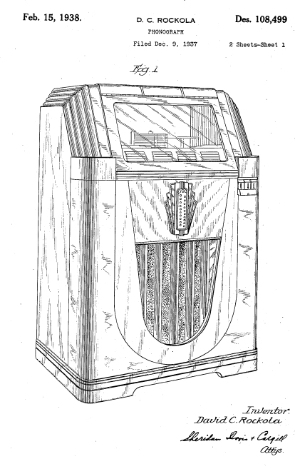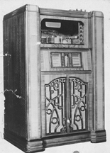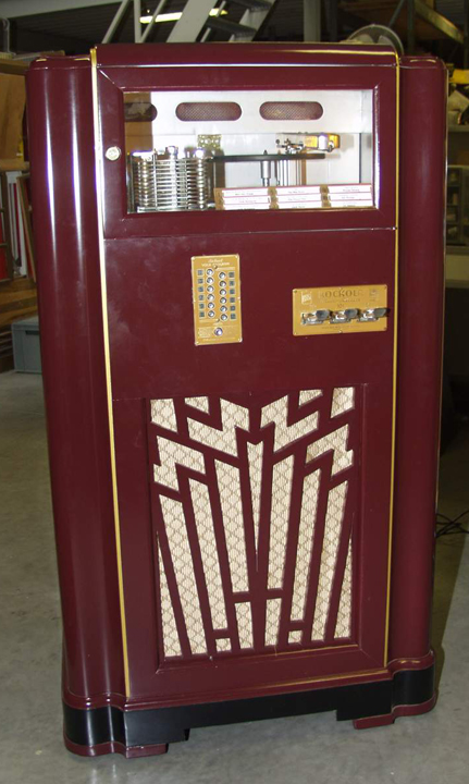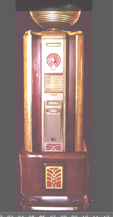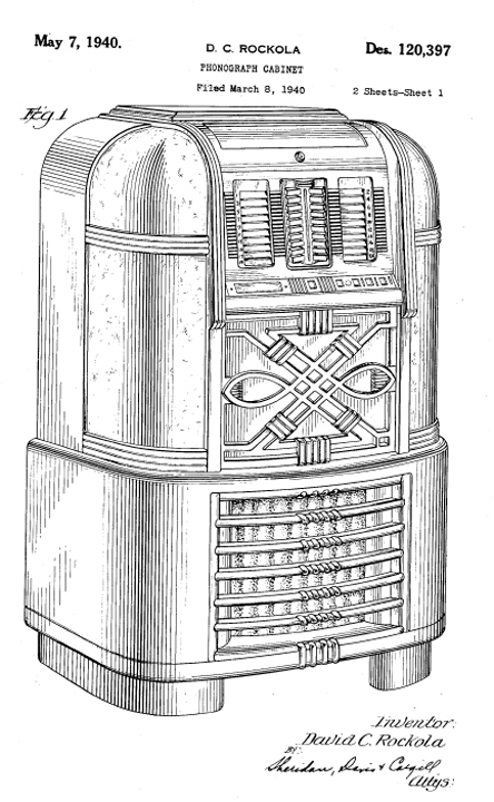 Rock-Ola "Luxury Light-Up" Design Patent D-120,397 Click here if you want to learn how to get Patent Drawings This was the flagship of the Rockola pre-war line. The Rock-Ola "Spectravox"This unusual machine had a telephone-dial selector -- if you wanted number 15, you dialed put your finger in the hole numbered "15" and dialed away. The changer was not located in this cabinet -- rather, it was hidden away in a back room in a unit called the Playmaster. The Spectravox took up a small amount of floor space which made it more saleable. The cabinet is made of metal with faux graining.