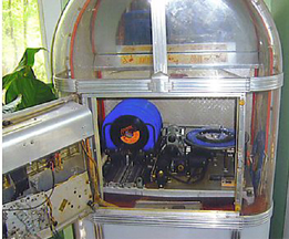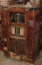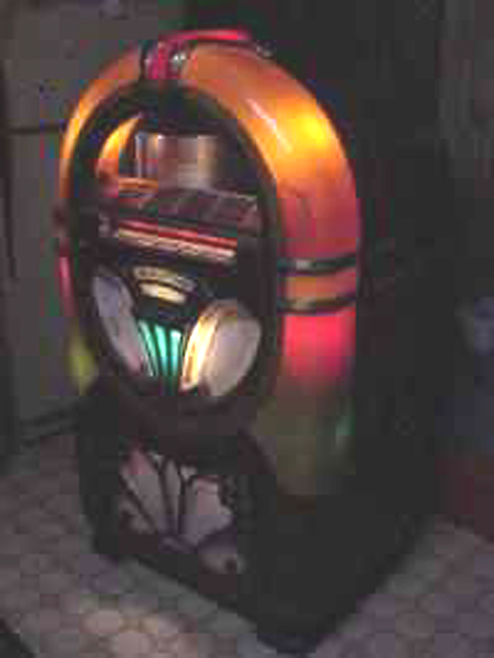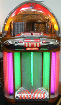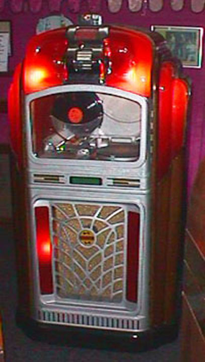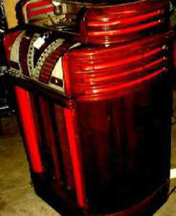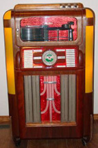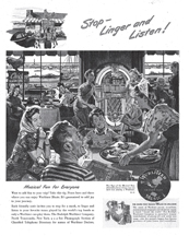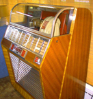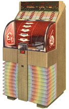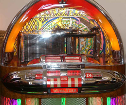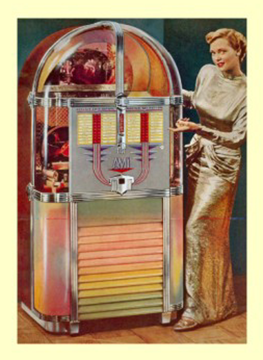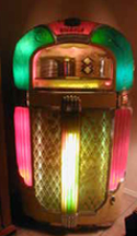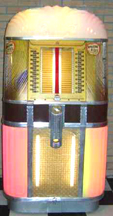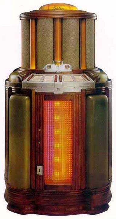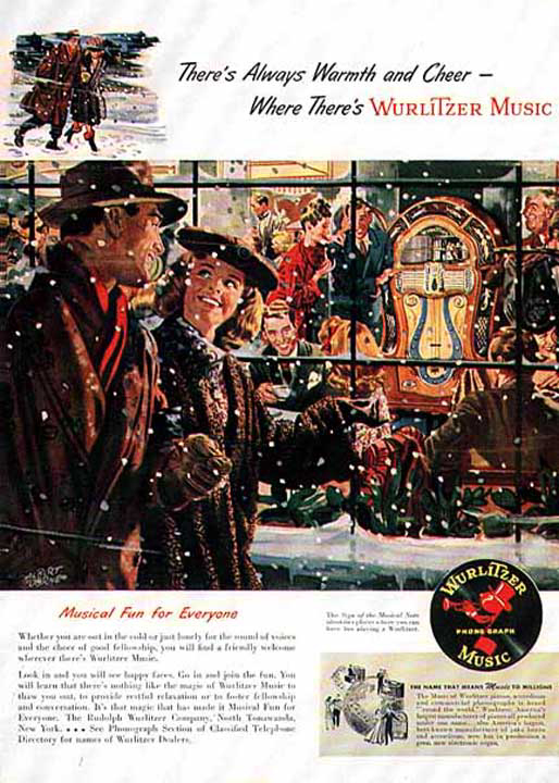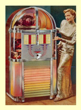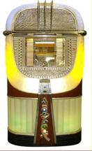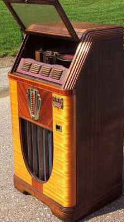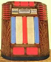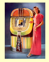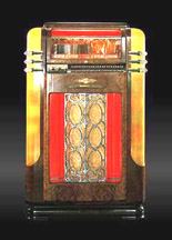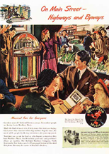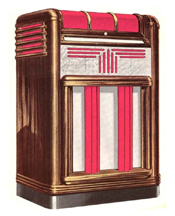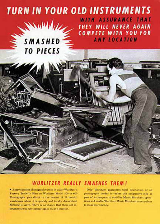 Seeburg Ads suggesting that the Juke was High Class Click to Enlarge As you might guess, there is a little sociology involved here. Manufacturers were continuously improving the technology and appearance of their products, sometimes with new variants issued on a monthly basis. The "very latest" machines with the most features and the best styling were designated "Top Boxes" and were destined for high end establishments. As the new moved in, the old was recycled down the status chain (of the time) until they reached rock bottom in the seedier roadhouses. In those bigoted times, when the machines reached into Negro neighborhoods, they acquired their enduring name, since "Juke" was slang at the time for "dancing". This is a lot less of a mouthful than "automatic coin operated phonograph," so like "Jitterbug", "Zoot" and "Rebop" the African-Americans had the last word. On a sad note, after the machine had been recycled down the chain, it was scavenged for parts and the rest destroyed. This is why boxes from the 1920s and 1930s are very rare. We Really Smash Them Wurlitzer Trade Ad from the 1930s By a new jukebox! The old one won't compete with you... In 1942-1945, the were sent overseas with the Armed Forces Click to Enlarge The Model 1015 had the largest production run of any single jukebox model. Wurlitzer estimates that more than 60,000 of the units were shipped. With bubbler tubes that changed colors, it was very entertaining -- so much so that owners preferred to keep this model instead of switching to newer boxes, even those with much improved technology. When the industry moved from 78 rpm to 45 rpm records, many of the 1015s were retrofitted and continued to serve in the 1950s. The natural downward evolution of the jukebox placed this machine in malt shops, drug stores and other places frequented by teenagers just at the time that Rock'n'Roll was emerging. The 1015 is, in fact, an icon of teen culture in the mid-1950s even though it was introduced in 1947 to play the music of their parents (see ad above.). It is the most often pictured jukebox and is immediately recognizable today. In fact, the remnants of the Wurlitzer company still makes them today -- they play CDs and some even use iPod technology to offer thousands of selections. You have a some choices now: