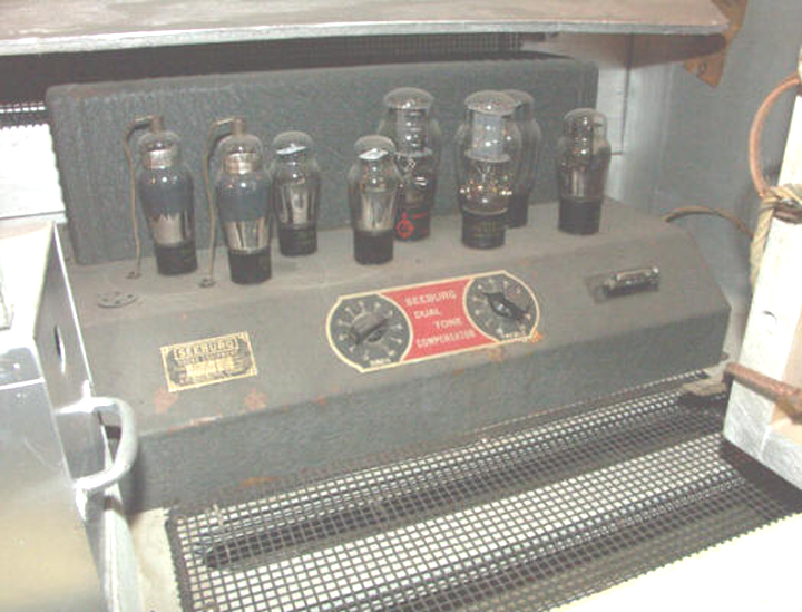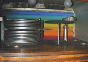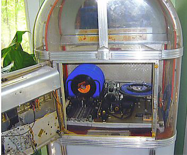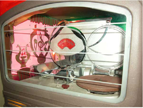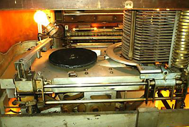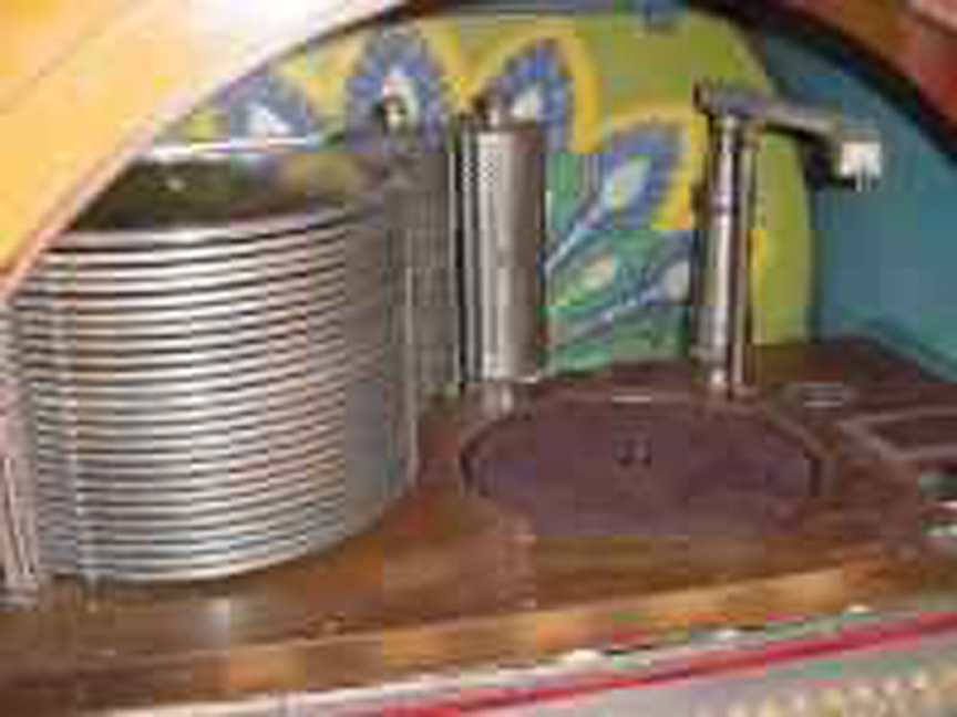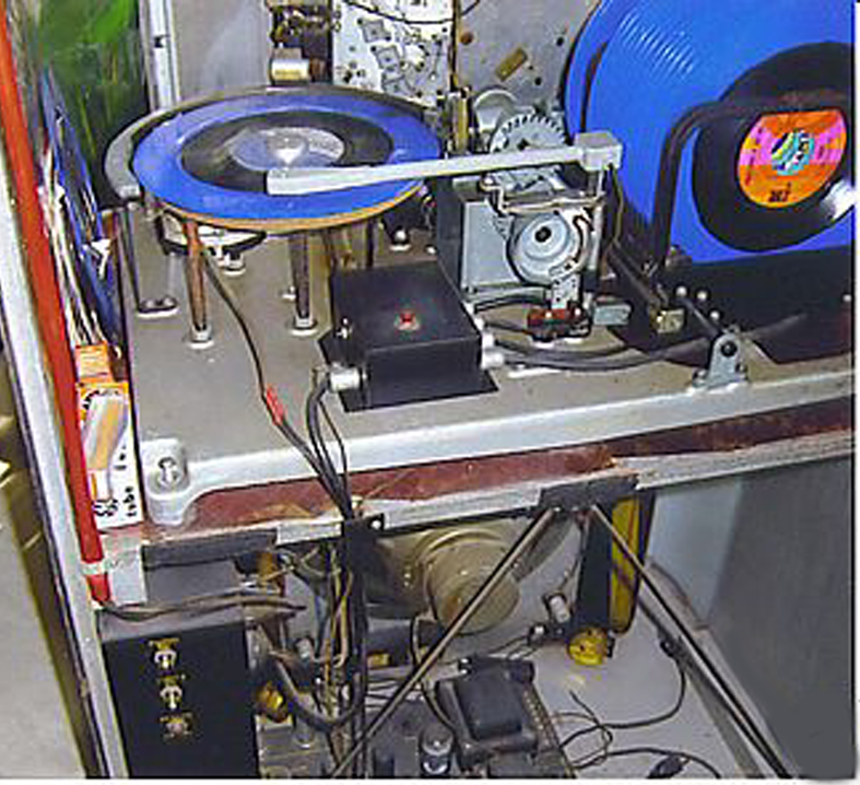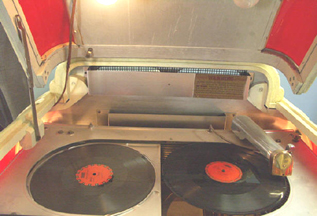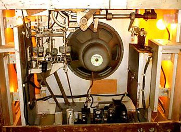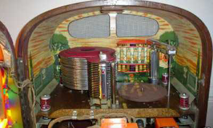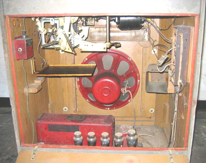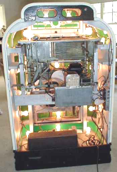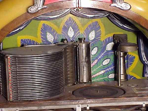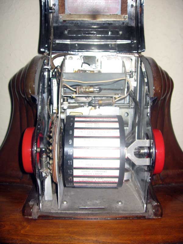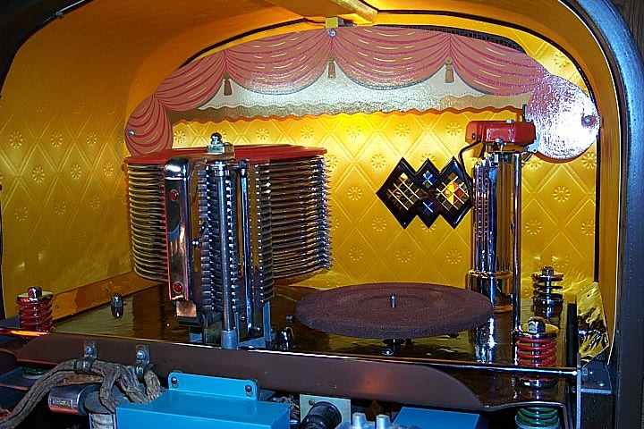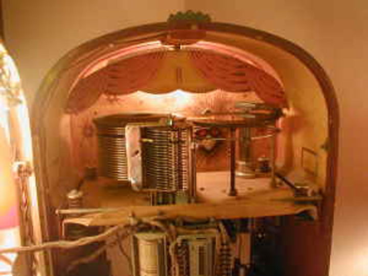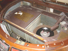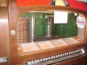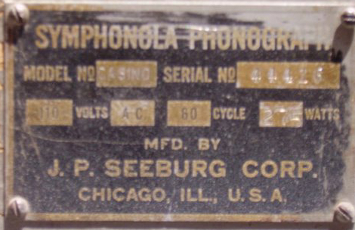 ![]() The Seeburg "Casino" (inside) The Manufacturer's plate Seebeurg jukeboxes never let the customer see the mechanism Clearance for the tone arm required that Seeburg models have a "bulge" on top
