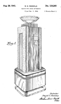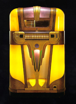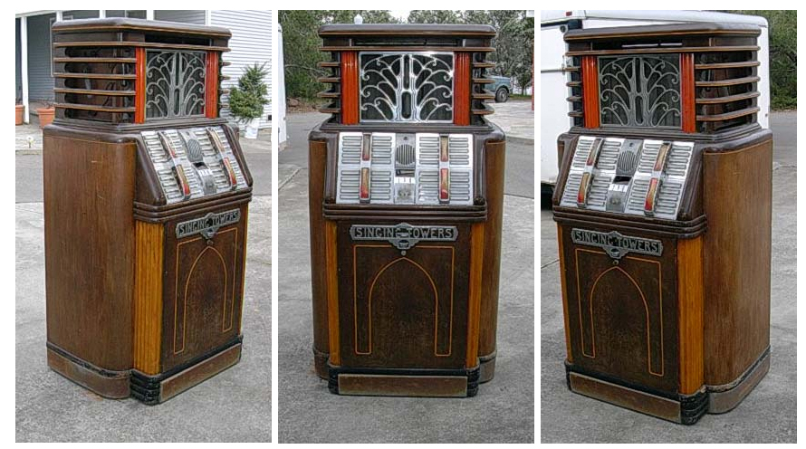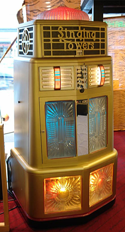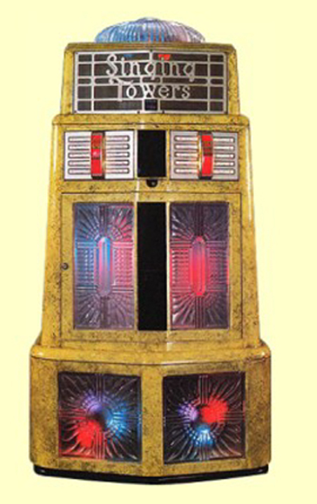 The AMI Singing Towers Jukebox (original) The AMI Singing Towers Jukebox (duplex variant) AMI Singing Towers Jukebox Design Patent D-132,724 Click here if you want to learn how to get Patent Drawings The jukebox case is done in faux stone, and everything (except the slector keys) is glass nearly an inch thick. This was a very innovative design but it did not gain wide acceptance. The AMI Model A, "Mother of Plastic"This was called the "Mother of Plastic" in 1946 long before Saddam Hussein warned of the "Mother of Battles." Our research has, in fact, failed to turn up any Iraqi dictators who had a hand in jukebox design. This was the first jukebox to go beyond bakelite (and catalin) to use acrylic plastics. The box also marked the introduction of shaped fluorescent lights. In fact the only incandescent light was located just below the coin return slot to illustrate the red, green and blue jewels on the center post. There were two color cylinders on either side of the base.