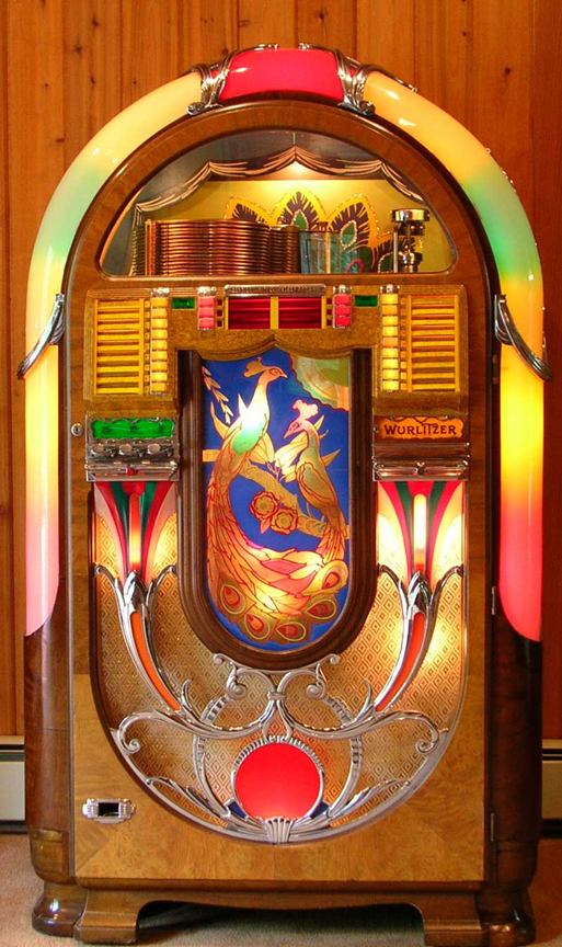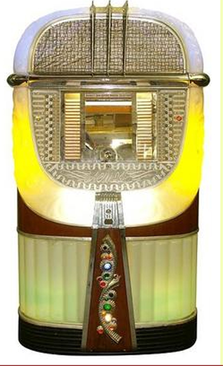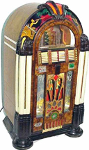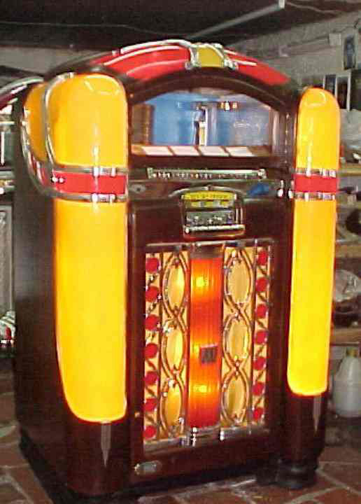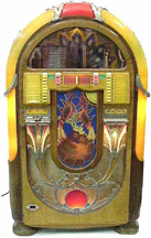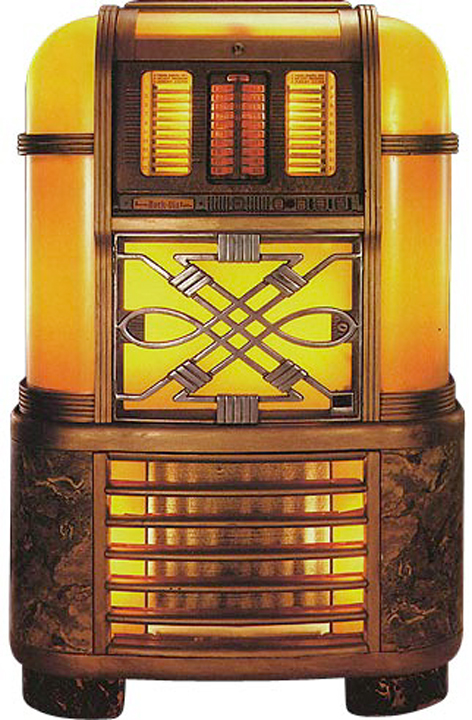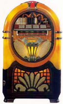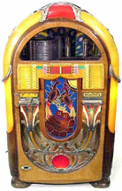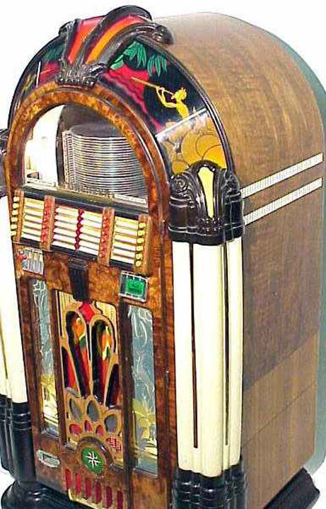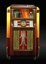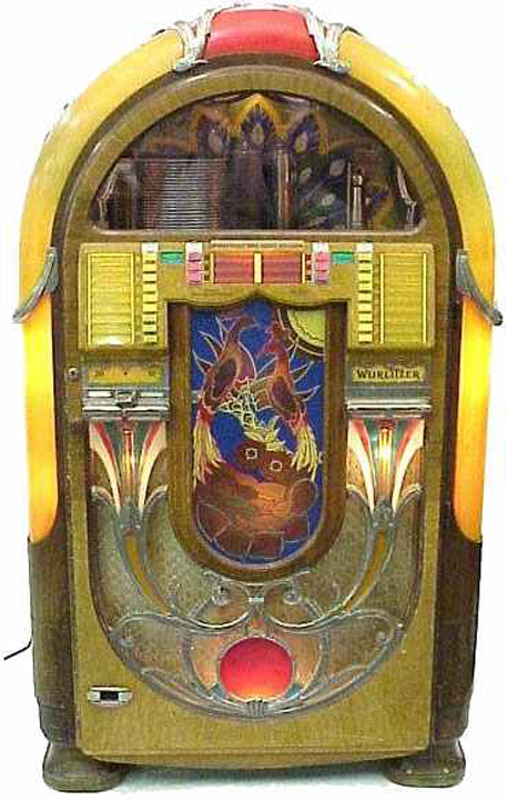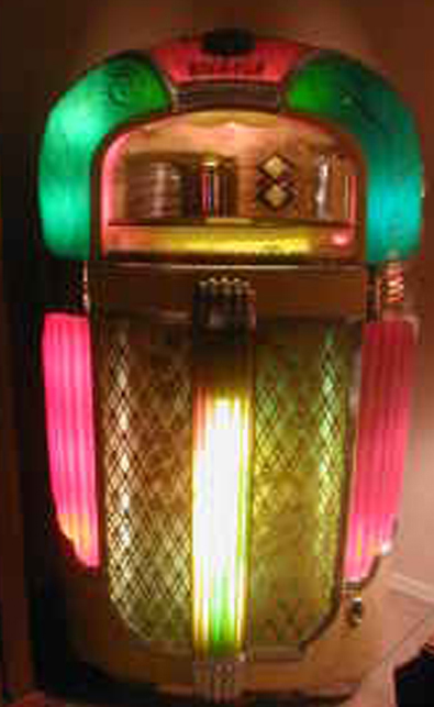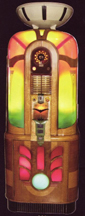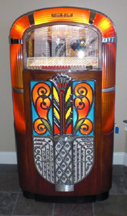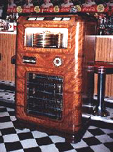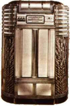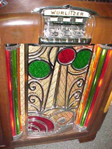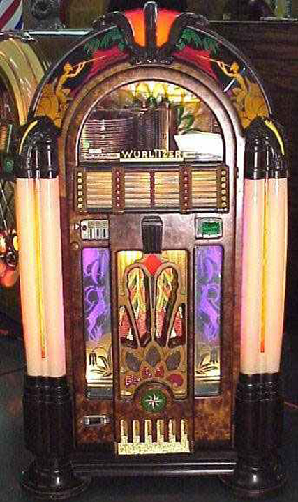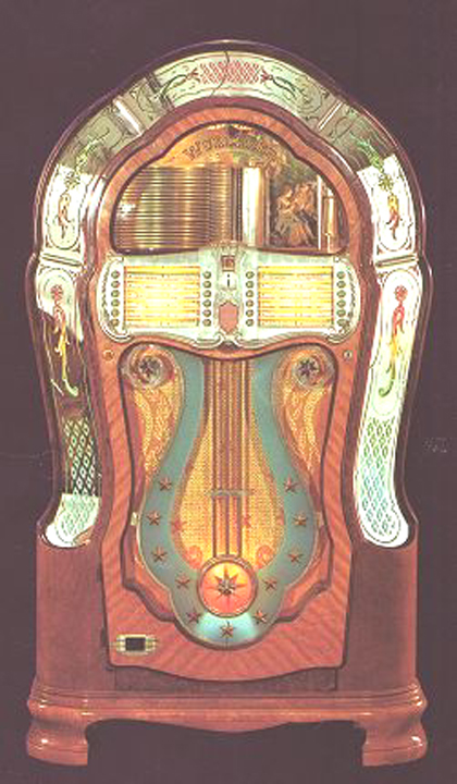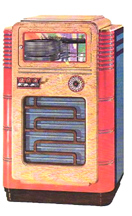 The Wurlitzer Model 950 Jukebox Gazelle, Pipes Of Pan, Flutes of Pan Click to Enlarge Many of the internal components, including the coin chutes, coin box and tone arm post are made of wood since metal was in short supply during the War. This is the rarest of all the Wurlitzer "Golden Age" jukeboxes, and some say the most beautiful. The Wurlitzer Model 1015Shortly after WWII (when wartime restrictions on building materials were removed), the Wurlitzer Company introduced the Model 1015 Jukebox with great success, saving the company from near-bankruptcy brought on by the Depression. The 1015 pushed Wurlitzer forward as the leader of jukebox manufacturing, with 56,000 units being sold in less than 2 years. This was the Golden Age of jukebox production. The 1015 wasn't just a huge hit in the United States, but also appeared anywhere Americans went, following GIs all over the globe. Also called the "1015-Bubbler", this juke is arguably the most popular jukebox of all time. It was also designed by Paul Fuller. With its illuminated, color-changing pilasters, 8 bubble tubes, shiny chrome and domed top, it is reflective of the positive, uplifted attitude of the post-war nation. The coin-operated 1015 plays 78-RPM records and has push-button Multi-Selector technology.