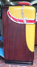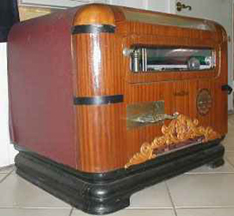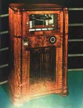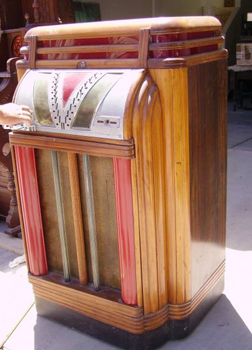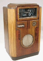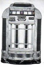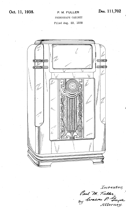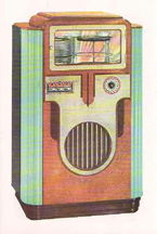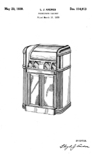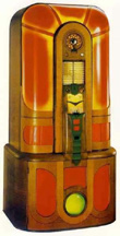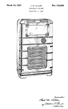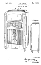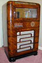 In the 20s, a Phonograph is a Phonograph, Home or Away Domestic Phonograph Design Patent D-99,277 Seeburg Audiphone c. 1928 Click to Enlarge Click here if you want to learn how to get Patent Drawings During the Great Depression, manufacturers found that they had to work a whole lot harder to get the customer to part with his/her hard-earned nickel. Wurlitzer and Seeburg, the "prestige" companies made wooden boxes, often with a high degree of traditional craftsmanship. On the other hand, the manufacturers of slot machines (Rock-Ola and Mills) and vending machines (AMI) employed "modern" design to attract customers, often using mirrors, bright lighting and the "streamlined" style that was very popular in films and luxury trains. The established manufacturers first tried to adapt wood construction to the new forms. In the beginning, "all-wood" models had an advantage since the craftsmen were already in place and understood the internal company operations. 1n 1934, Wurlitzer took a step away from lyres, curlicues and church organs and produced new Deco-styled models, called the "P-Series" (the "Princess", "Debutante", etc). Although they had smooth lines and veneer effects, the P Series had only moderate success. In 1934 there was significant sales resistance due to the depression, and it was debatable whether people were rejecting Art deco design or jukeboxes in general. In 1936, Wurlitzer got into Deco in a big way with the "300" series (The "Modern") which also had limited acceptance. During the period 1934-1937, Paul Fuller, the genius behind Wurlitzer's styling turned out a wide variety of Art Deco-styled boxes using fanciful veneer schemes, not at all unlike the trends in furniture. These boxes used the Simplex mechanism, increasing the number of selections gradually from 12 to 24. These last vestiges of the all-wood jukebox are quite attractive and serviceable. Because Wurlitzer had a policy of destroying old boxes, these machines are now quite rare. Finally, "reluctance to spend" was ruled out given dramatic increases in sales of other products therough brightly lit vending machines. The jukebox manufacturers finally came to the conclusion that a significant potion of the public was willing to step into the future. Their initial policy was to manufacture both kinds of boxes, thinking that the upper classes would prefer the richness of traditional woods (actually veneers on plywood). As we'll see below, sales figures ended the all-wood jukebox cabinet by 1940 (roughly). Wurlitzer P-12 "Princess"The "P" series is a very hesitant step into the world of Art Deco. It is plain but tasteful, the kind of thing that middle class people were supposed to want. It did not sell well.