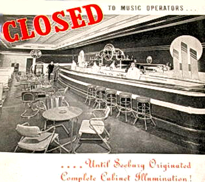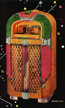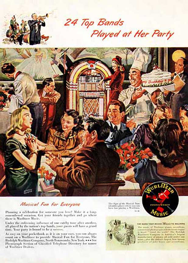 This "Introduction" is on all three jukebox pages. If you have read it before (or don't want to read it), you can go directly to the pictures of Jukeboxes. If you're reading this in 2009 (or later), the word "jukebox" means a gaudy prop in a retro diner or an image on a "Fabulous Fifties" party favor. In fact, if not for retro theme restaurants (like the Silver Diner), most of you would have never seen or heard of a jukebox. It is about a 50-1 bet that none of you have ever seen a real mechanical jukebox playing 78 rpm records, and it's about 1000-1 that any of you ever played a song for a nickel in a roadhouse. I'm writing this to integrate a lot of information that's out there on the internet. I'm going to package it for you so that you get a little history, a little mechanical engineering, some business strategy and a true aesthetic experience. We're also going to toss in some of the original patents so that you can see how things work. First of all, they're not jukeboxes -- back in the day, they were known as coin-operated phonographs. They were found in the best of establishments and were a multimillion dollar business. The cast of characters includes a wide variety of colorful individuals including brilliant designers, a millionaire right-wing Senator, gangsters, and even the KGB. This was cutting-edge technology that pushed electro-mechanics to its limits. It was the beginning of "hi-fi" and it was the pulse of the nation's taste in music -- the Radio and TV show Your Hit Parade informed listeners that the ratings were based on a survey of: "the best sellers on sheet music and phonograph records, the songs most heard on the air and most played on the automatic coin machines, an accurate, authentic tabulation of America's taste in popular music." Most people who danced during the period 1930-1950 did so to music provided by a jukebox. With the exception of the very, very elite places, most restaurants from Chez Pierre to Pete's Bar had a coin-operated phonograph to provide dance music to their customers. This was a LOT of places, and it is generally estimated that two million boxes were made. The folks who made coin operated phonographs (principally Wurlitzer, AMI and Seeburg) engaged in large scale nationwide advertising campaigns to convince poeople that the jukebox was a legitimate and "high-class" form of entertainment. Of these, Wurlitzer is the most remembered name, thanks to two factors: (1) a remarkable series of full-page ads drawn by Albert Dorne and (2)the Model 1015 Jukebox, both of which are shown below: 1947 Albert Dorne Ad Featuring the Wurlitzer Model 1015 Jukebox Click to Enlarge By examining this ad, we can learn a little about the times. First, you'll note that this scene takes place in a fairly classy restaurant -- the waiter (upper left) is wearing a mess jacket. There is a mural of a prince and princess on the wall, and the headwaiter (smiling at the kitchen door in black tie) is presiding over a birthday party for a lucky young lady. Not only that, a cliche chef in toque and pencil moustache has prepared a special (and large) birthday cake. There are a dozen roses on the table. All of the [clearly] non-ethnic patrons are having the time of their life. There is nothing at all about this scene that could be remotely considered as "low class." Here are some ads from the Seeburg company's internal paper. One shows a really classy Art Deco bar that had recently been "closed" to jukeboxes; the other shows a white-tie wedding with music by a jukebox. [this was only possible in the Seeburg magazine...]