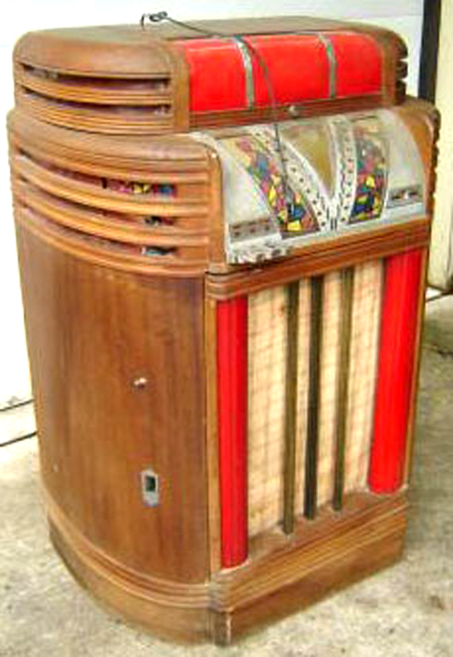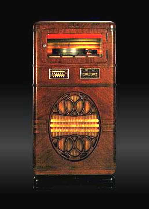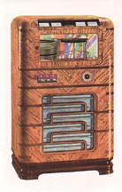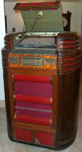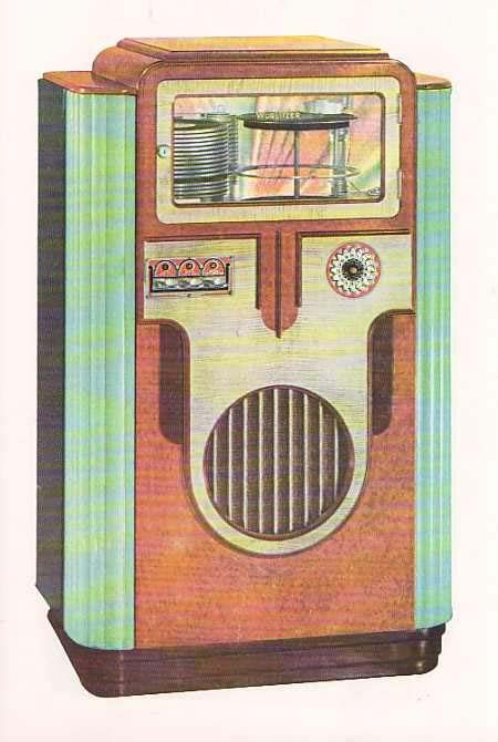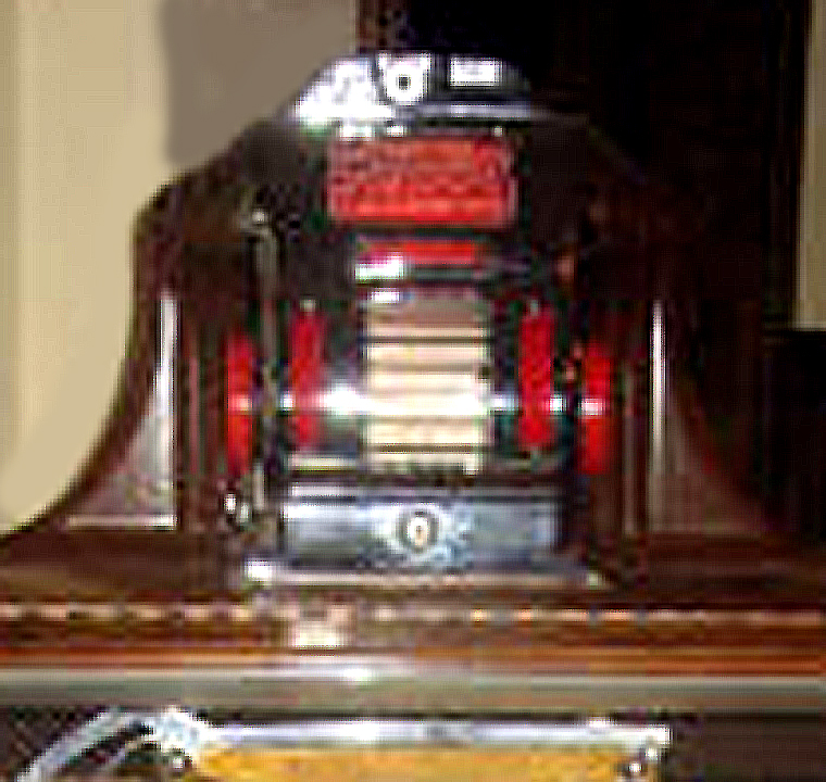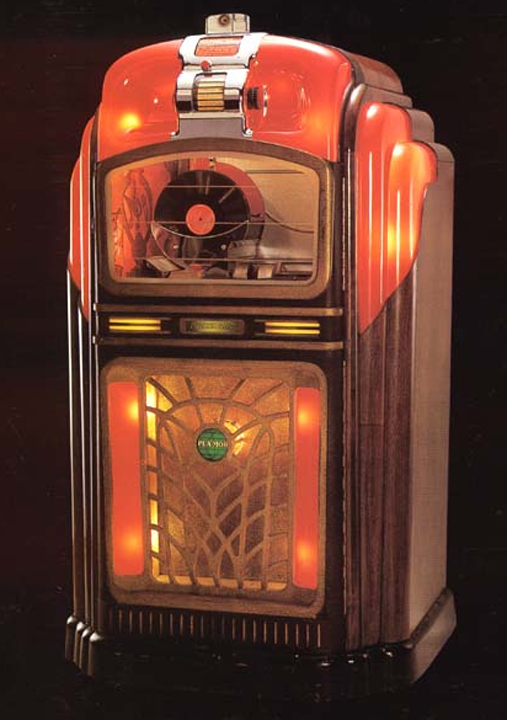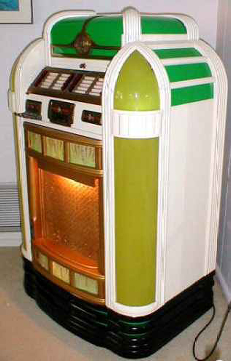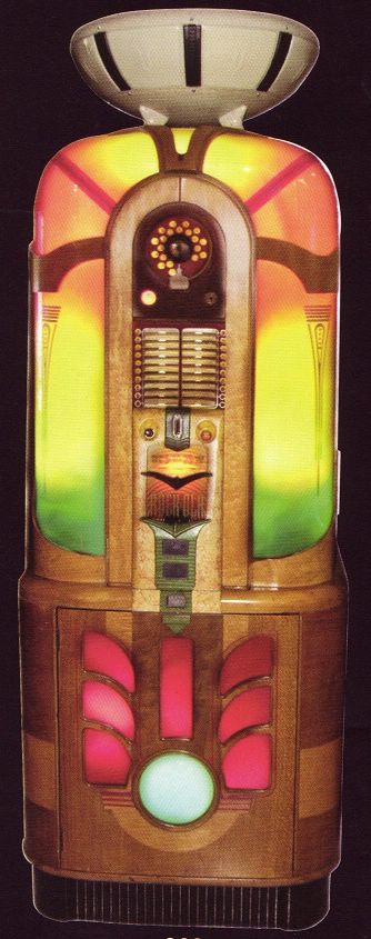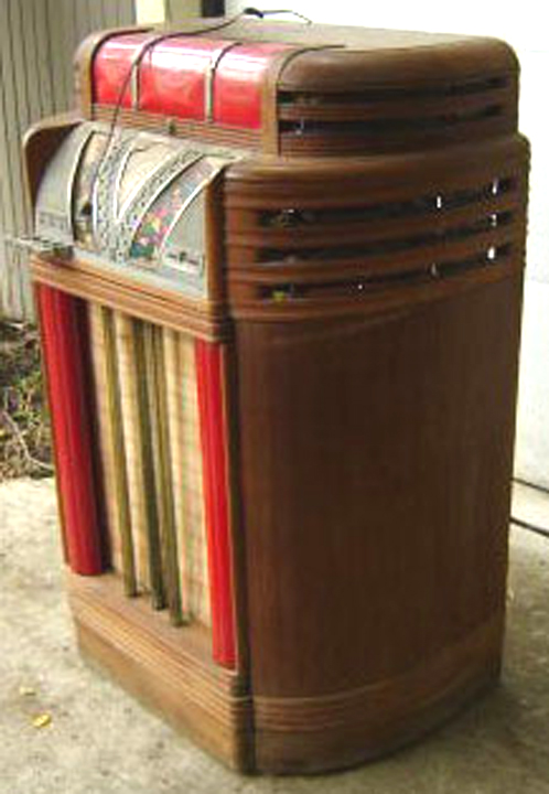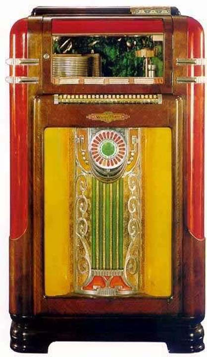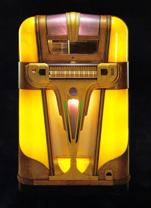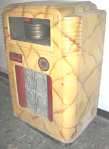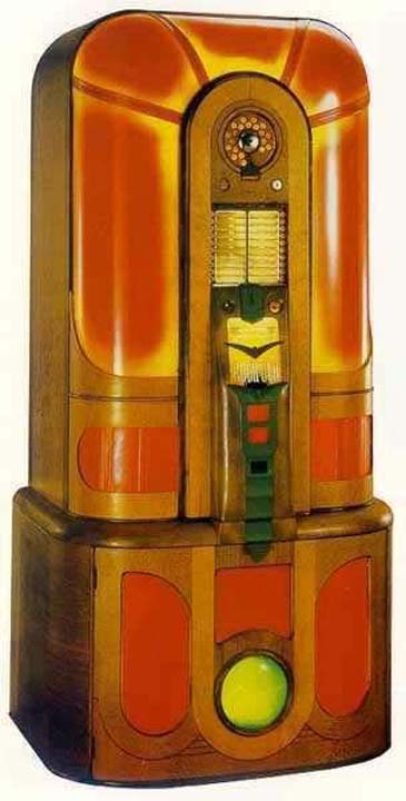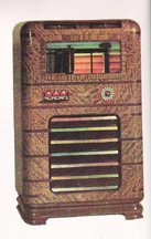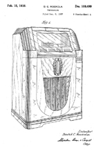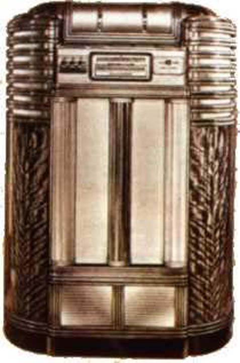 The Wurlitzer Console 50 Design patent D-109,555 Click here if you want to learn how to get Patent Drawings Here is a video of the Wurlitzer model 50 in action, playing "Swing High" by the Tommy Dorsey Orchestra This is a video of the Model 50 mechanism in action. The difference this time was that Wurlitzer was also offering a "light-up" jukebox that incorporated plastic panels. The Model 50 was not successful. Wurlitzer never went back to all wood, and their sales skyrocketed. Seeburg and Rockola had a similar history. By 1938 everybody was making gee-whix jukeboxes that did everything but reach into your pocket for a nickel. The Rock-Ola "Model A"David Rockola, fresh from a brush with the law in Chicago over slot machines, settled in California and began to manufacture jukeboxes. His first efforts had wood cases that were not particularly interesting. They are included here to show representative examples of what Wurlitzer's competition was doing during the "wood" era.
