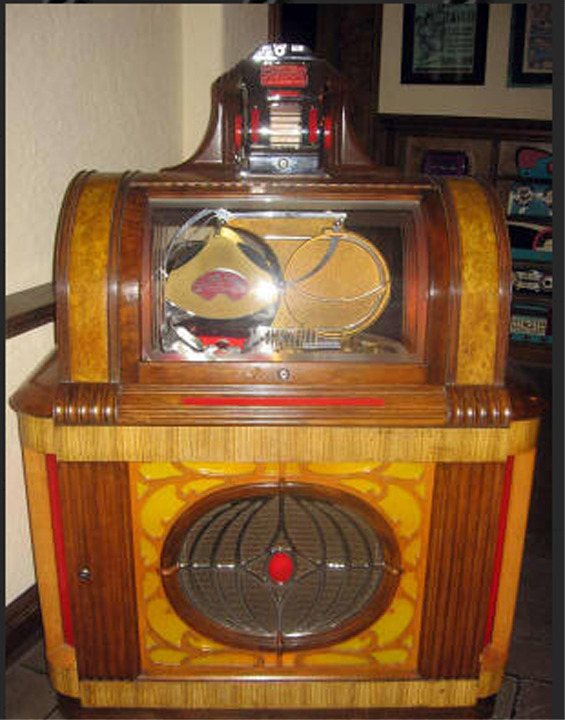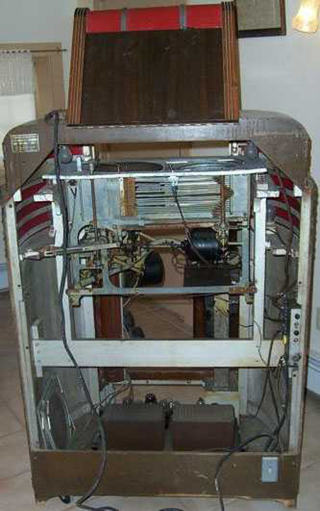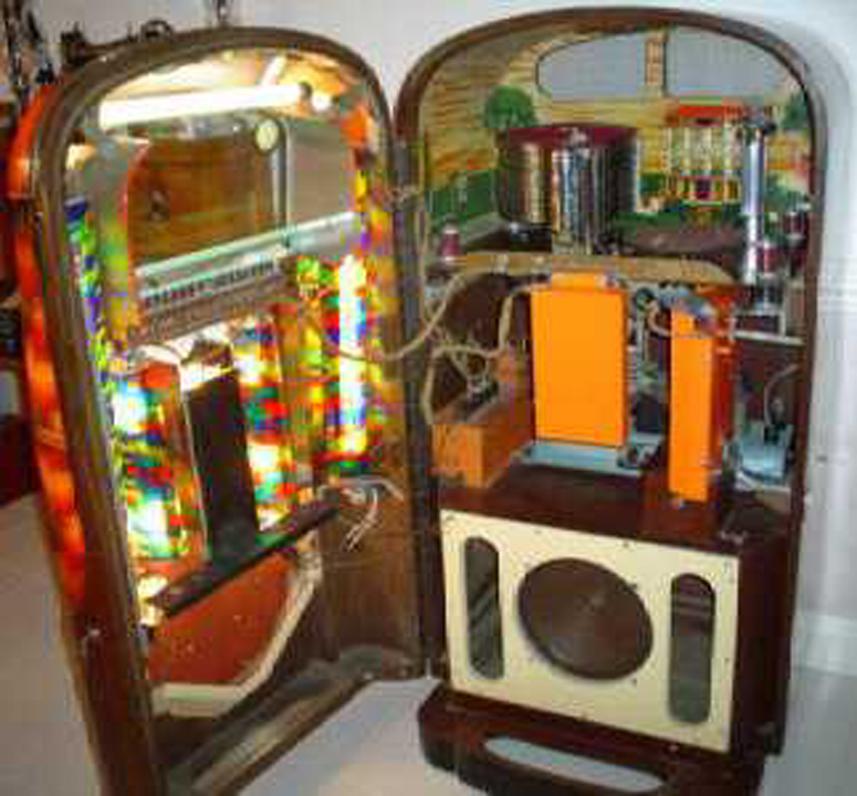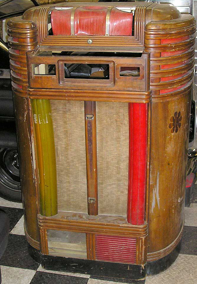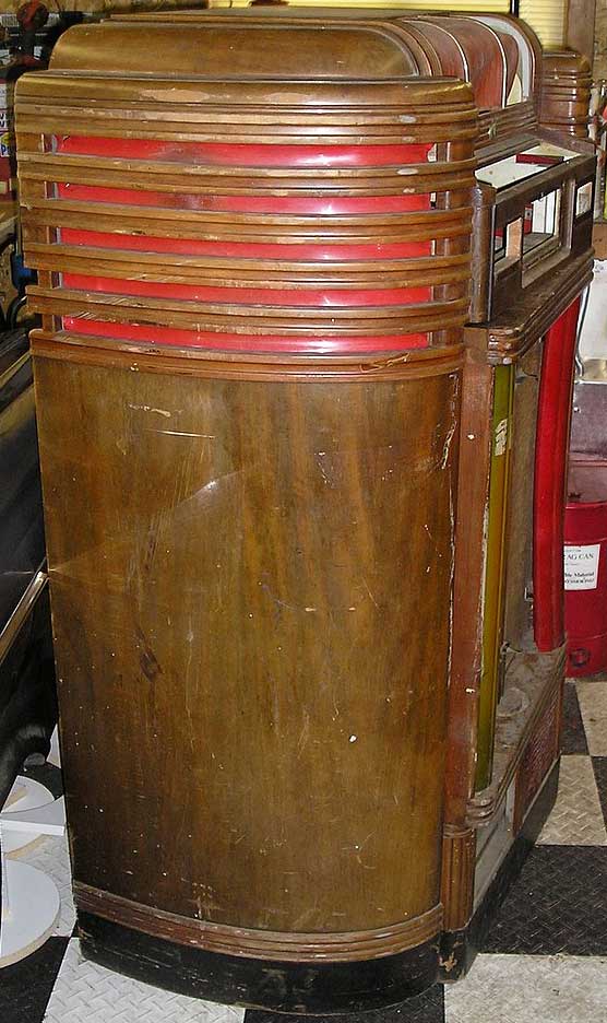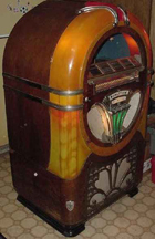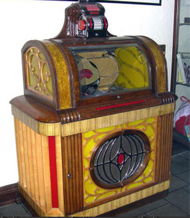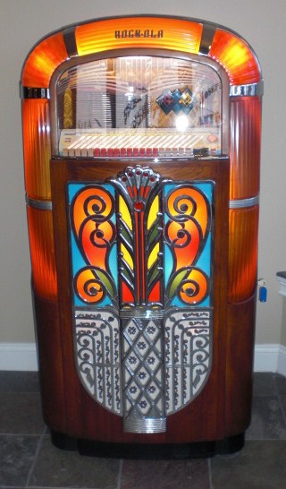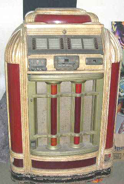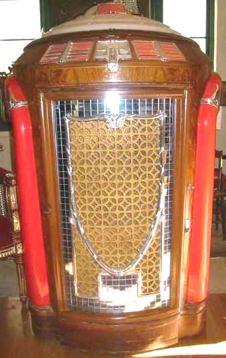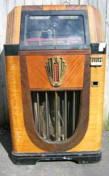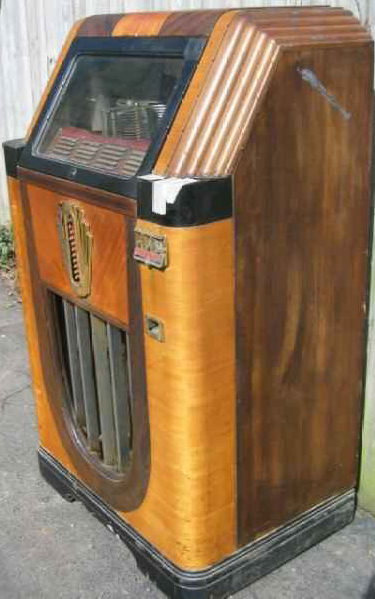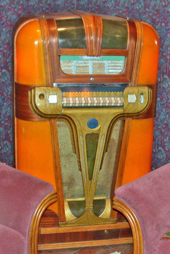 The Wurlitzer Console 50 Design patent D-109,555 Click here if you want to learn how to get Patent Drawings Here is a video of the Wurlitzer model 50 in action, playing "Swing High" by the Tommy Dorsey Orchestra This is a video of the Model 50 mechanism in action. The difference this time was that Wurlitzer was also offering a "light-up" jukebox that incorporated plastic panels. The Model 50 was not successful. Wurlitzer never went back to all wood, and their sales skyrocketed. Seeburg and Rockola had a similar history. By 1938 everybody was making gee-whix jukeboxes that did everything but reach into your pocket for a nickel. The Rock-Ola "Model A"David Rockola, fresh from a brush with the law in Chicago over slot machines, settled in California and began to manufacture jukeboxes. His first efforts had wood cases that were not particularly interesting. They are included here to show representative examples of what Wurlitzer's competition was doing during the "wood" era.