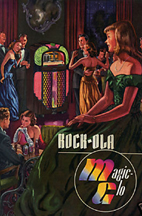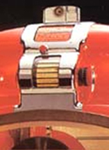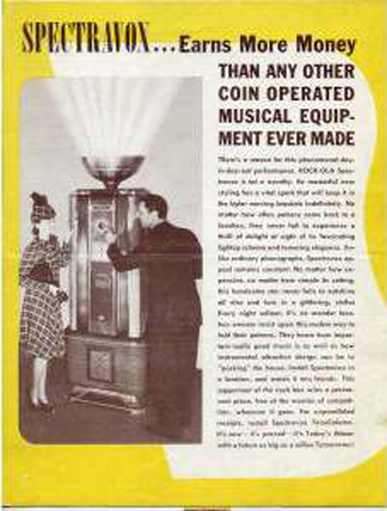 Rock-Ola "Spectravox" Jukebox Design Patent D-127,924 and 129,205 Click here if you want to learn how to get Patent Drawings The bowl on the top is always an item of curiosity. The brochure (above) is misleading -- the speaker was at the top of the column and sound reflected off the metal bowl. (Sound was not projected upward from the bowl as the ad would have you believe.) The Rock-Ola "Commando" and "Premier"This is a self-contained variant on the Spectravox. The selector, changer and playback mechanism were enclosed in the unusual cabinet. If you squint at it, it is almost as if the Spectravox is being enveloped by a cloud of fire. Plastic was in short supply during and right after World War II, so all the surfaces are made of glass, renedring the "Commando" quite delicate.
