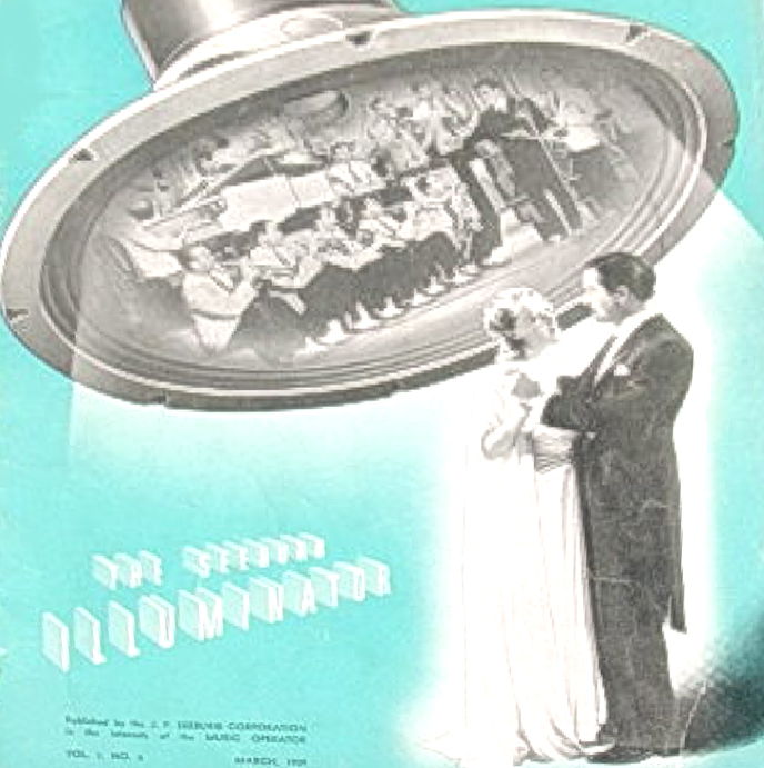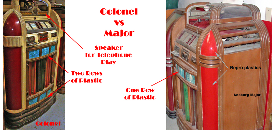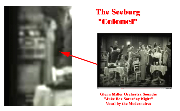 The Seeburg "Major" (Unrestored Condition) The Seeburg "Colonel" Featured in a Soundie If you haven't heard of Soundies, Check out our page on Mills Company Panoram This is the Glenn Miller Orchestra doing Juke Box Saturday Night Click to Enlarge Click here if you want to learn how to get Patent Drawings The various boxes in this series are hard to tell apart. The "Major" and his superior, the "Colonel" are a good case in point. Our reader Dave offers this suggestion: "... the Seeburg Major is smaller in size, and has one row of blue/red/green grille plastics on lower front door. The 'Colonel' has two rows. See attached pictures. The 'Colonel' picture is a telephone line version. ..." Difference Between the Seeburg Colonel and Major See our discussion of the Telephone Jukebox Click to Enlarge A Seeburg Colonel appears in the Warner Brothers 1941 film Manpower, featuring George Raft, Marlene Dietrich and Edward G. Robinson. In the film, the "Colonel" (complete with telephone access capability) sits in Bennys Hamburger Hut, near Boulder Dam. The box probably came from the prop room because it is unlikely that telephone access would be available in that location. Look for it at about 1:18 into the film. Here is a video of a Seeburg "Classic" jukebox in action. The song is "Only You", performed by The Platters (on record) along with an inept dude trying his hand at Karaoke. The Seeburg "Commander", "Cadet", "Concertmaster", etc.The unusual appendage at the top of the 1940 vintage Commander and its littermates is the "Dual-Toneflow" system that had vertically and horizontally oriented speakers to project sound throughout the room. Seeburg also began using polarizers to induce color spectrum effects. In their penchant for creating product names, this was called "Polarized Rainbo-Glo". Illustration of the Dual Toneflow System and Polarized Raninbo-Glo