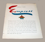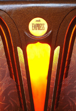 The Mills Novelty Co. "Empress" Yellow Color Scheme, Red Color Scheme (lit and unlit) and Grille Detail Click to Enlarge The metal facing that ties the selector and the speaker grille is styled with delicacy. There were a number of color combinations available but the yellow/violet combination may not be correct from a historical perspective. Our reader Dave comments: "... The [yellow/violet] photo is cut off on bottom and the purple center plastics are photographers artistic license, it never came with purple plastics. Here is a better picture of a historically correct Mills Empress... Mills machines did not work well on location, as they ate records... I Spoke to a serviceman from the 40's who said he had 'job security' servicing Mills jukeboxes ..." Here is Dave's photo and the cover of his brochure for the Mills Empress.