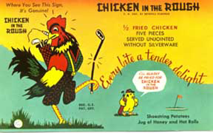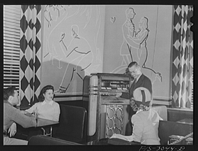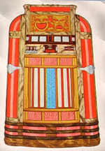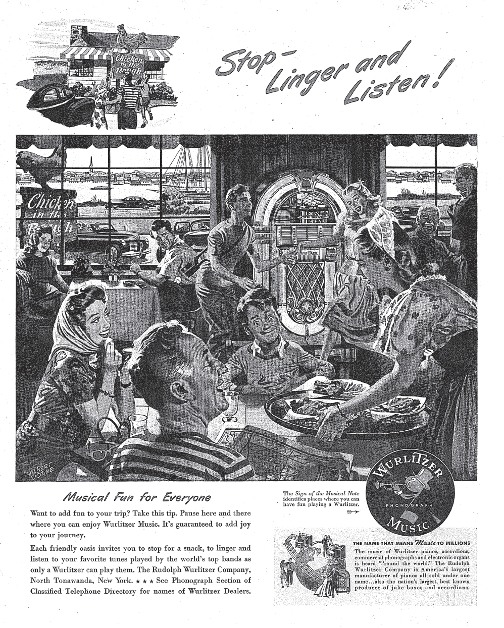 Swing Dancing and the Model 1015 Albert Dorne Ad and "Chicken in the Rough" Postcard Click to Enlarge Above is one of those memorable Albert Dorne ads that glorifies the Model 1015. The scene is in a New England seaside restaurant. Dad fusses over a map, while Junior is delighted to get his serving of "Chicken in the Rough". Parenthetically, this was a real restaurant chain -- half a chicken was breaded, fried and served in a basket with fries without silverware. I've also shown an advertising postcard for the chain. If you can't read it, the little chick (who is serving as caddy) says "I'd gladly be fried for Chicken in the Rough" There was a nationwide fad for the stuff in the 1940s. Today "CITR" items from restaurants are very collectible. Chicken aside, this ad is significant in that it is the ONLY 1940s ad that shows people swing dancing in front of a Model 1015. That's it -- the entire legend, repeated ad nauseam on cutesy 1950s party favors, grows from this one ad. The model 1015 was produced from 1946 to 1947, and was so popular that many of them survived into into the 1950s; in fact, this creation of the 1940s is an icon of the sock-hop and rock'n'roll era. By 1954 the popular 45-RPM records induced the Wurlitzer factory to make conversion kits to adapt the 1015. In 1986 Wurlitzer celebrated the 40th anniversary of the 1015 by manufacturing it once again, marketing it as the "One More Time". It had the classic design of the 1015 with all the latest technology, including the ability to play CDs. Through the years, there have been many Wurlitzer 1015s that appeared in background shots of TV shows and films like "Cheers", "Friends", "Back to the Future" and "On the Waterfront" to name a few.